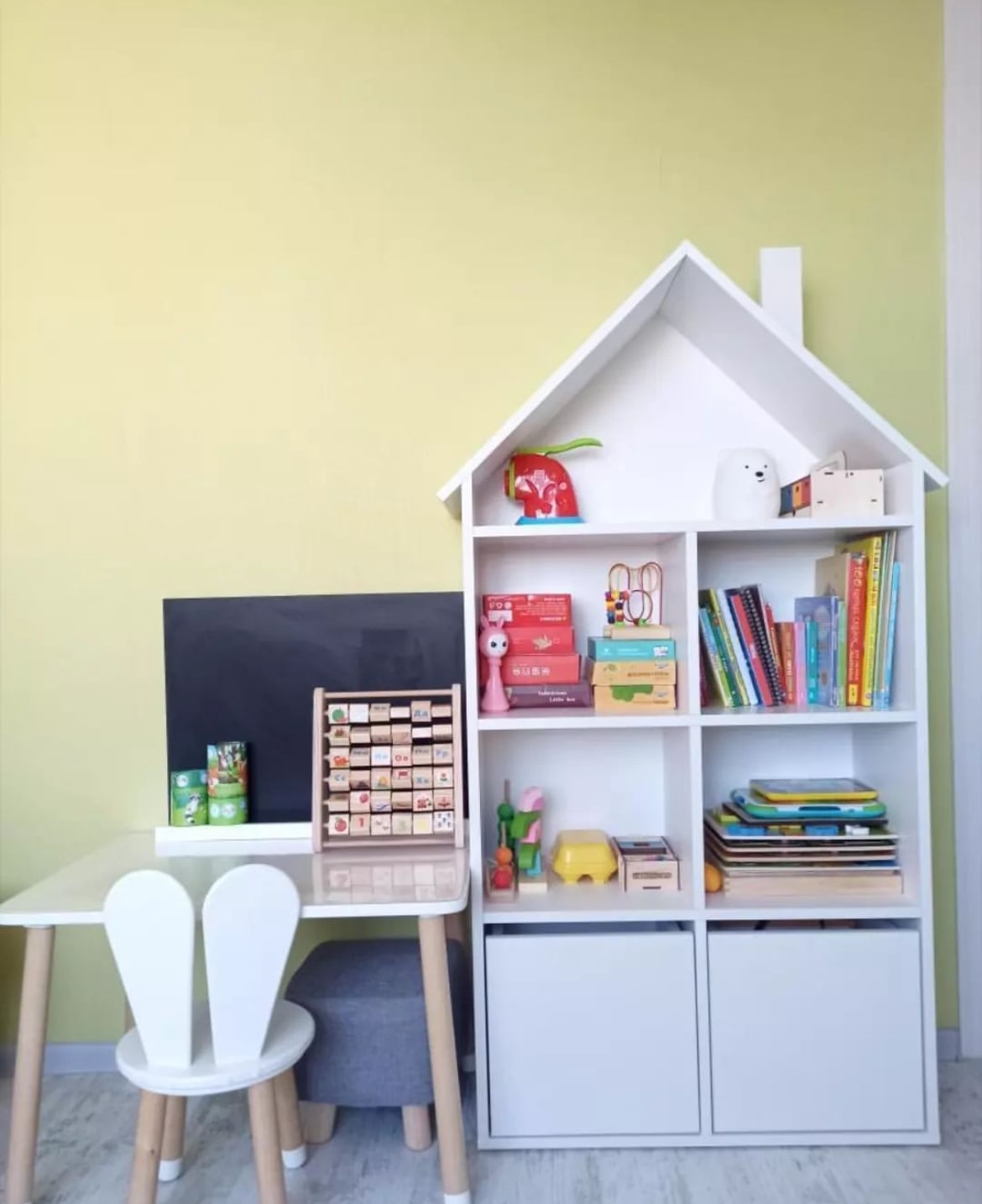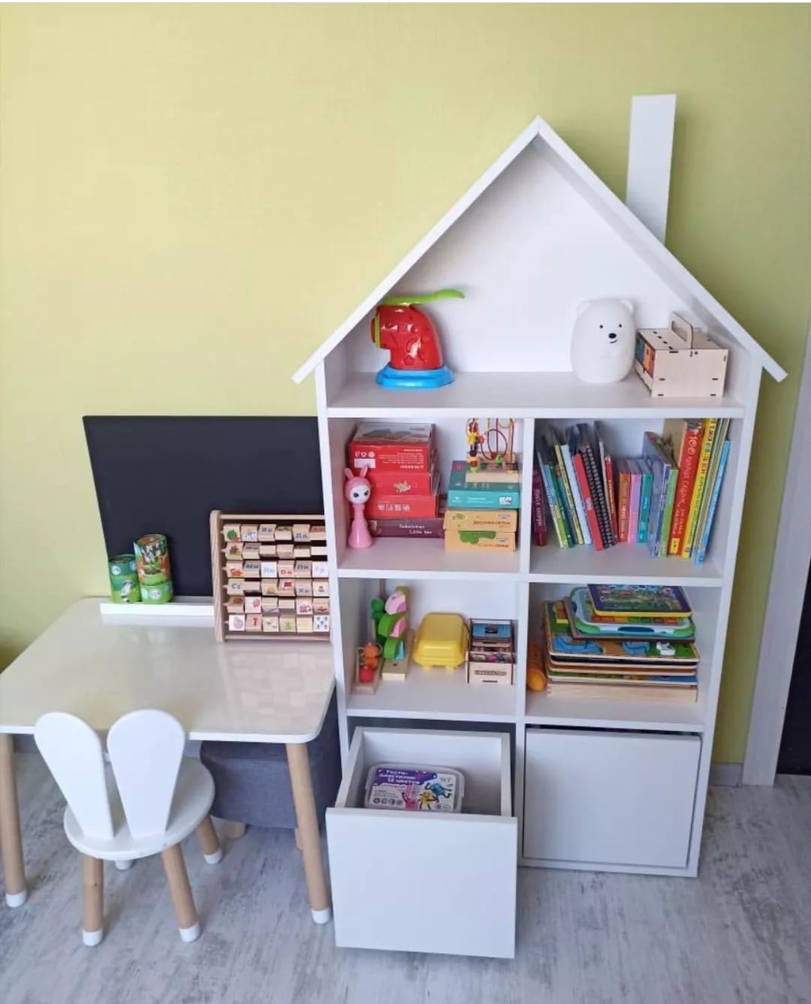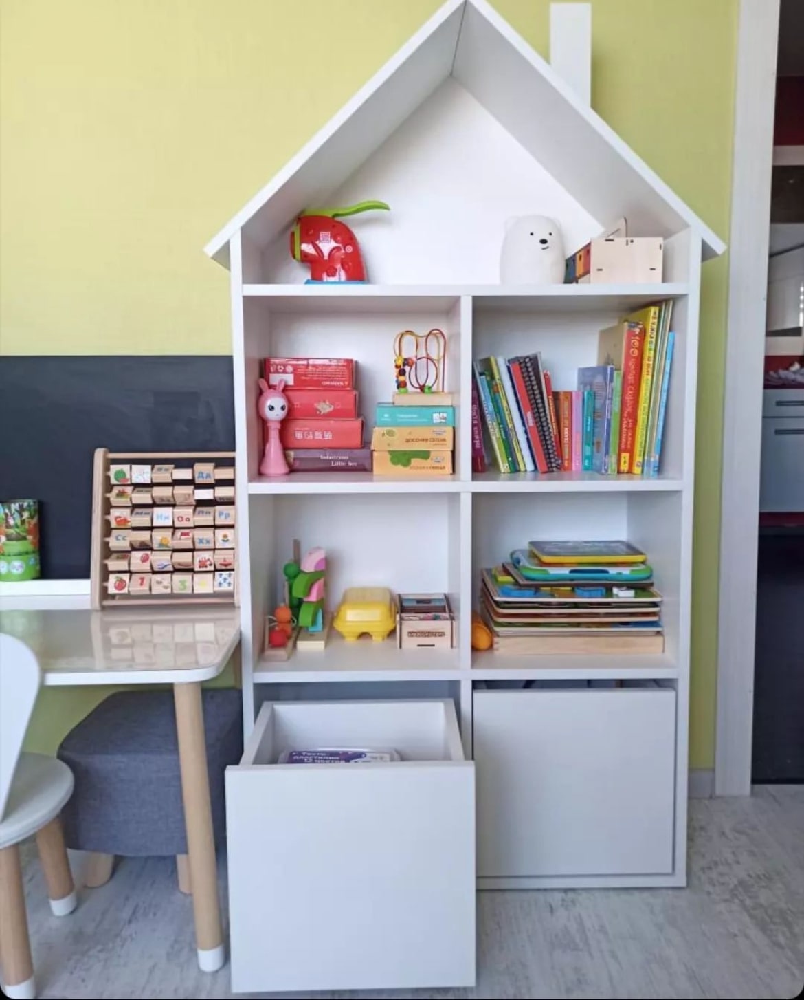 Домик-стеллаж отлично дополнит пространство для детского творчества.