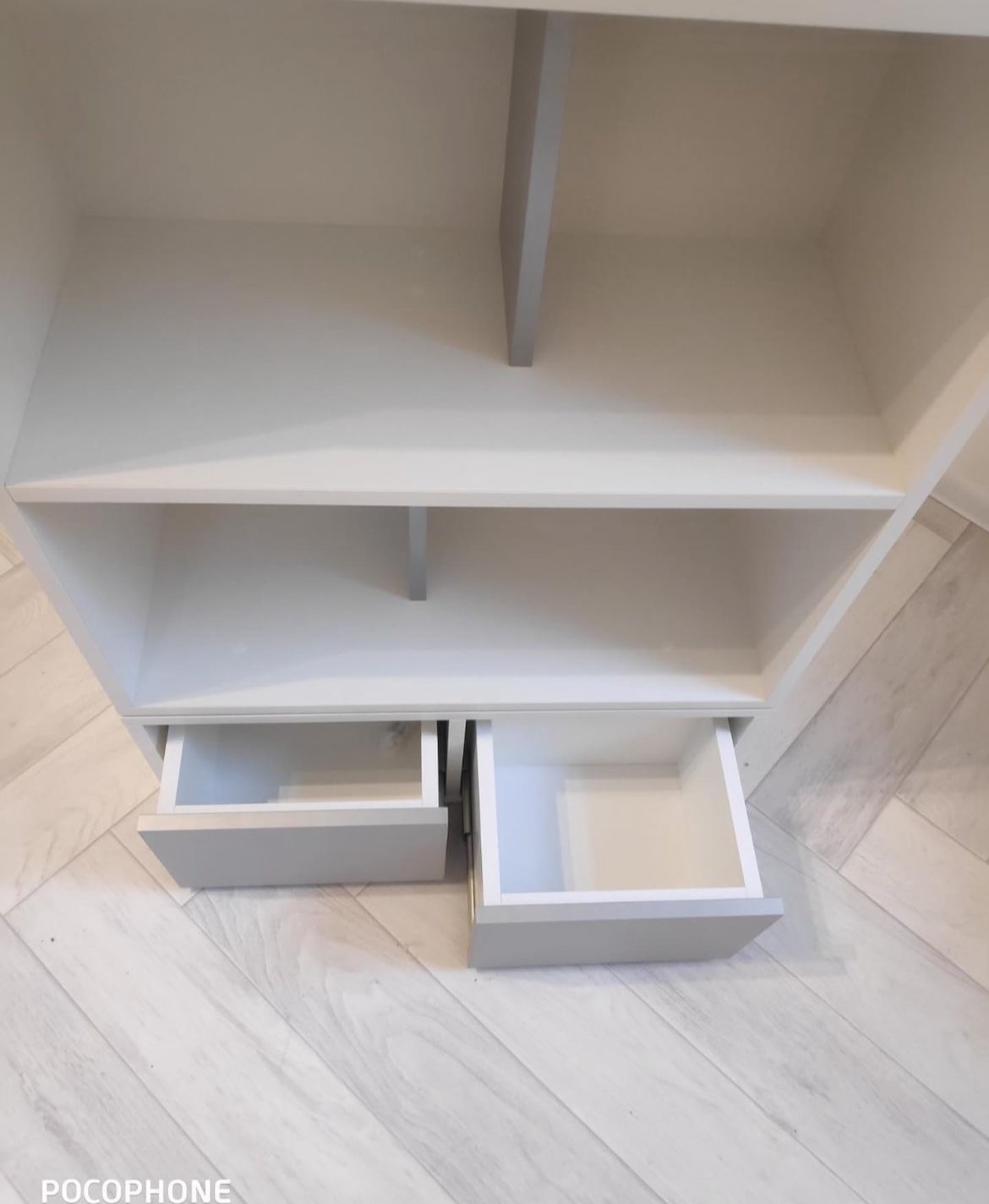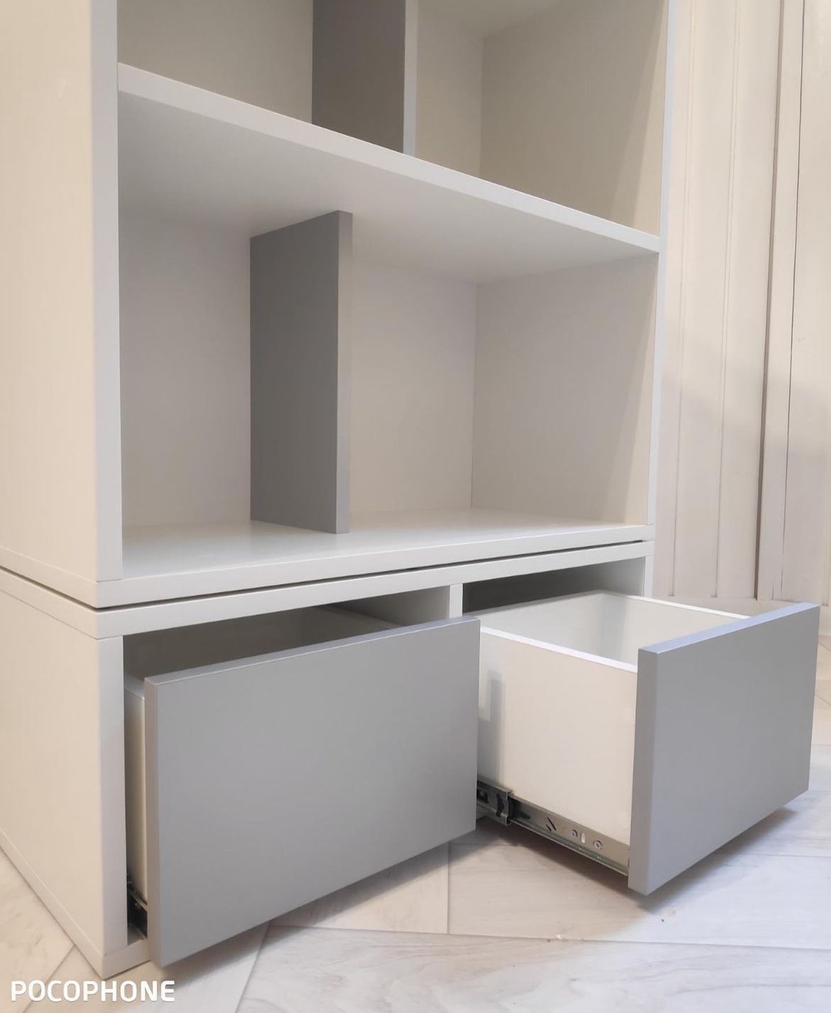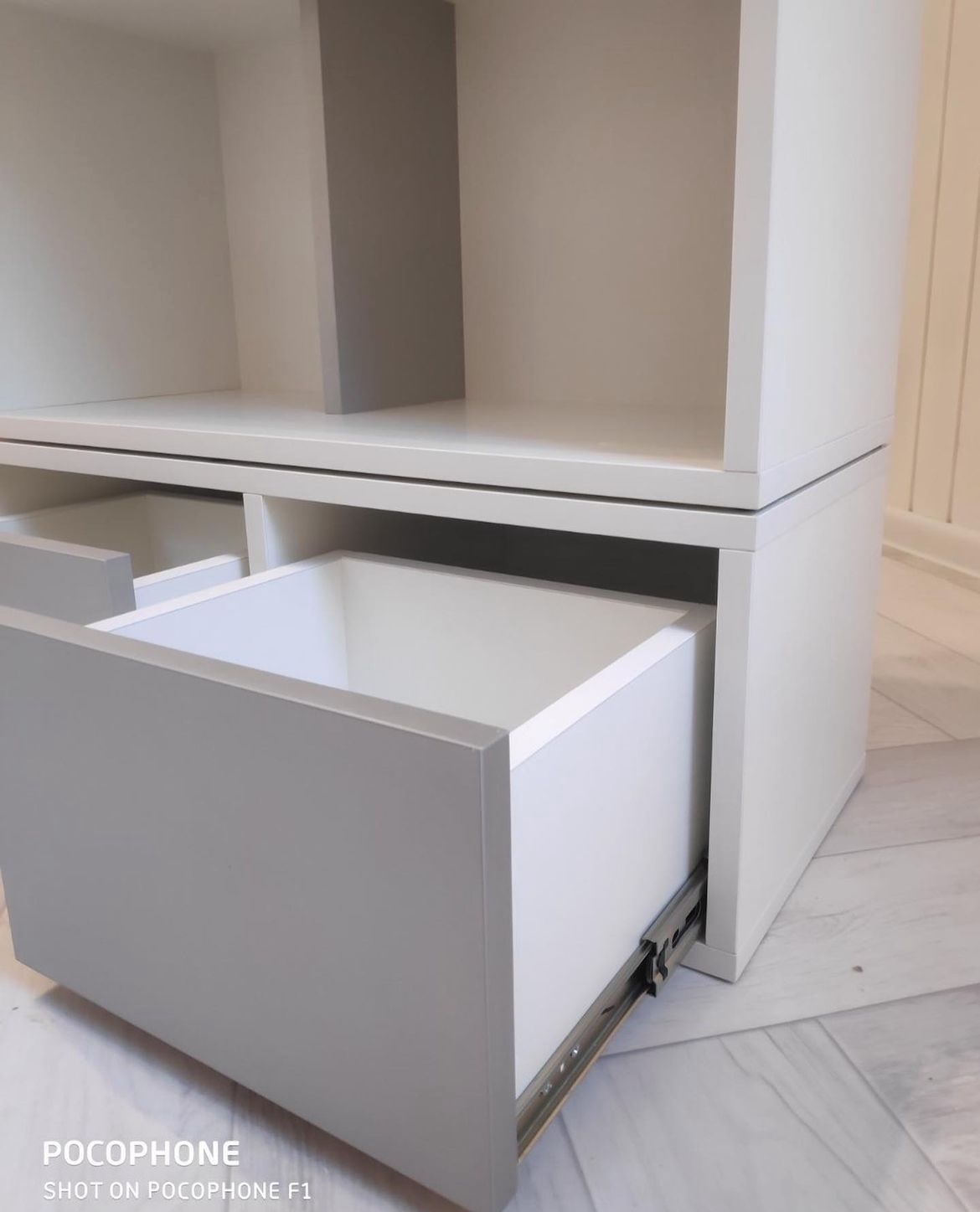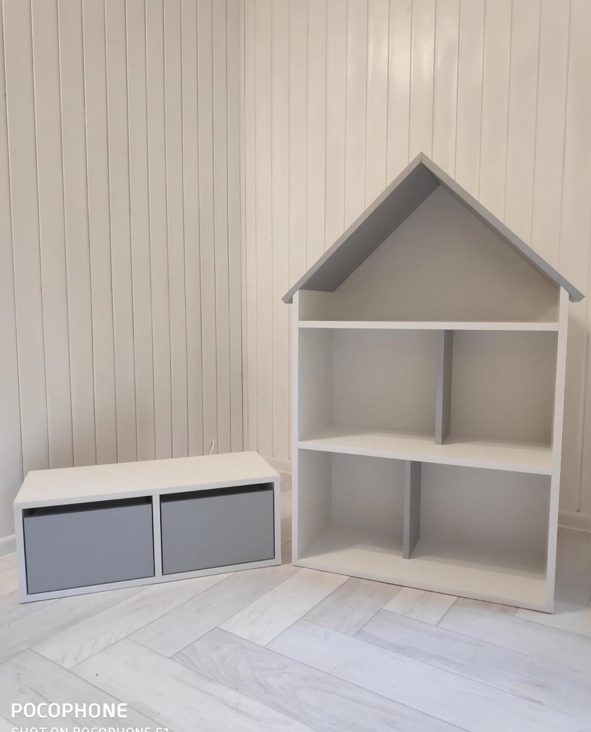Модель домика из двух частей, нижний блок с выдвижными ящиками на шариковых направляющих полного выдвижения.