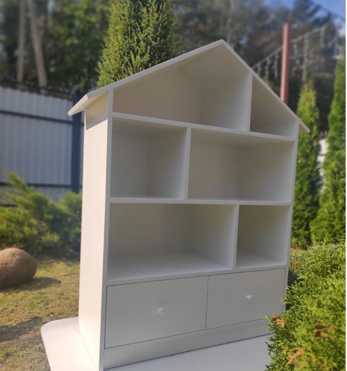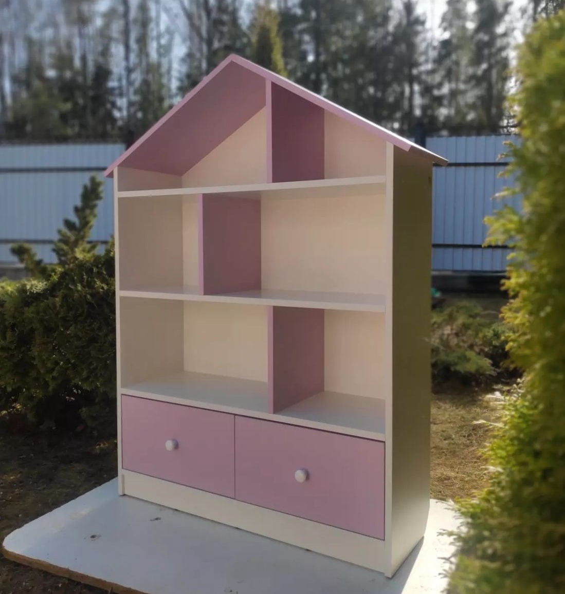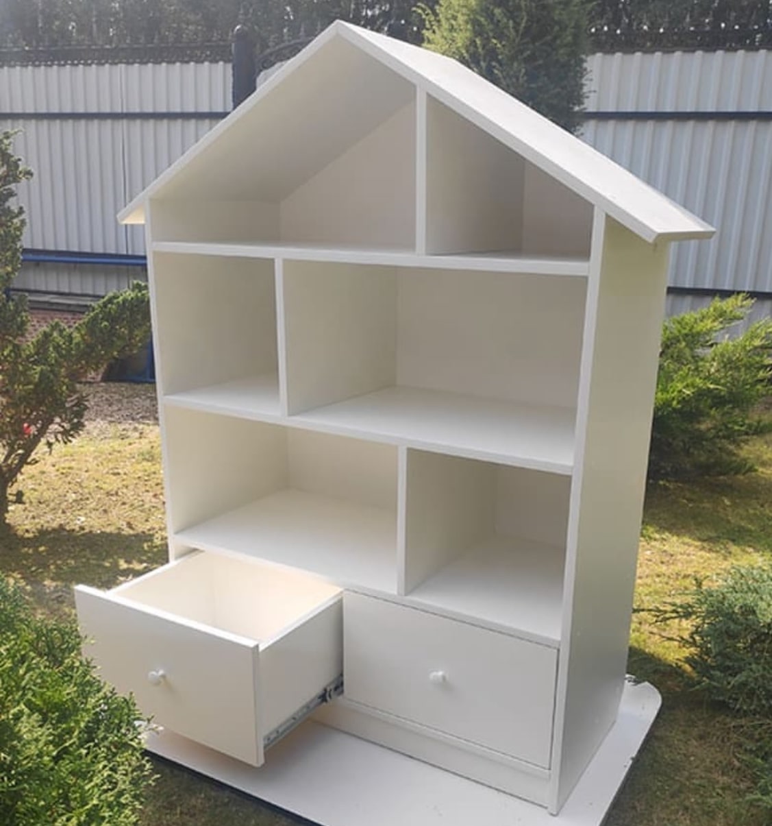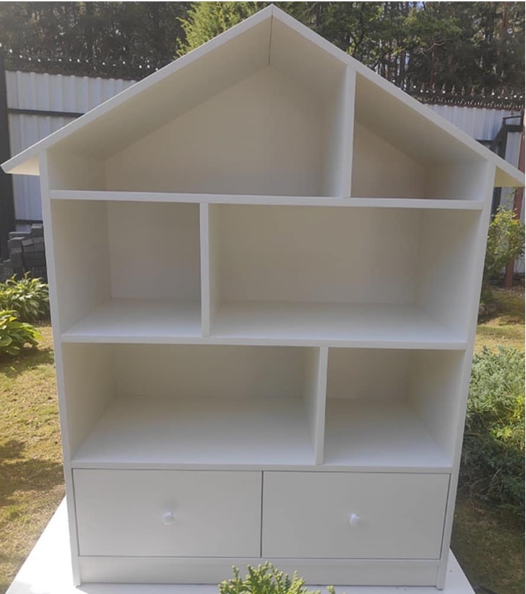 Домик-стеллаж с двумя выдвижными ящиками на шариковых направляющих полного выдвижения. Модель домика цельная.