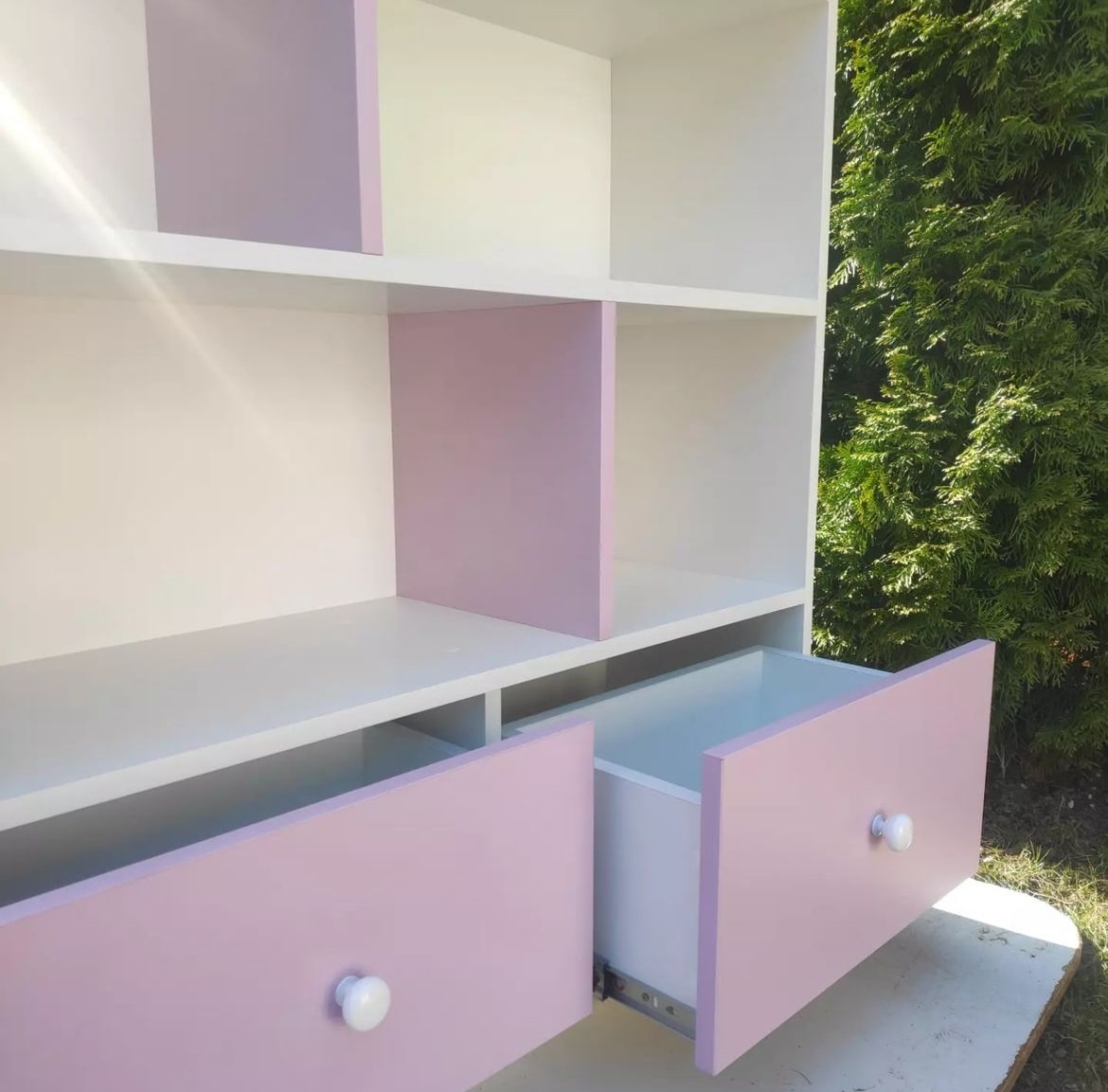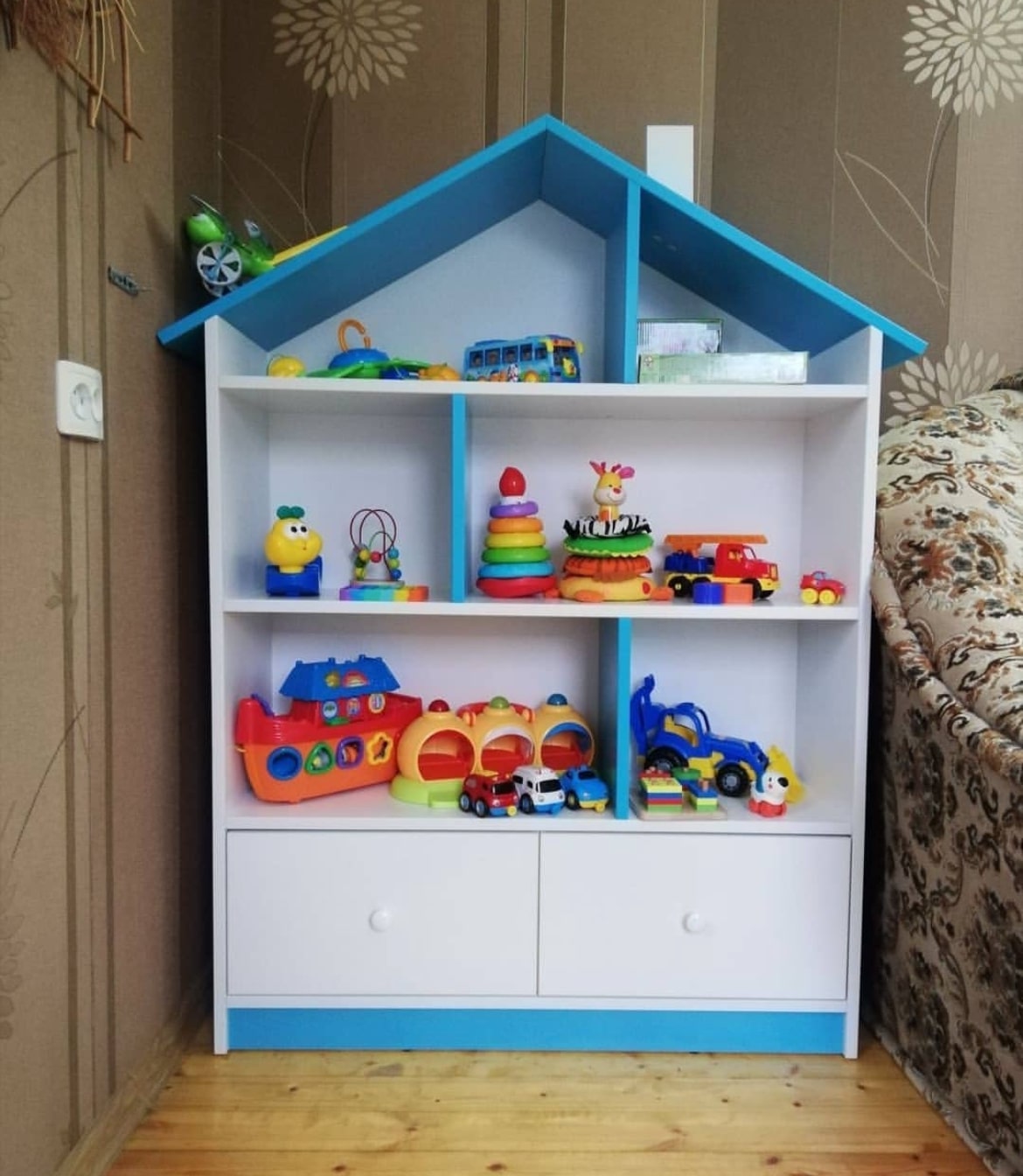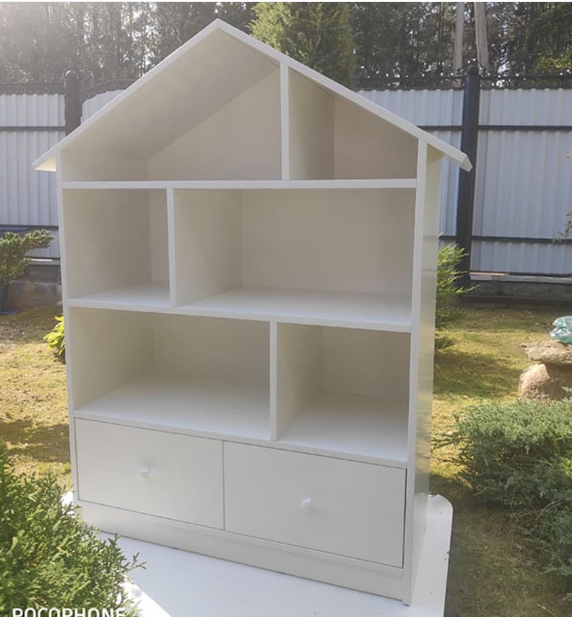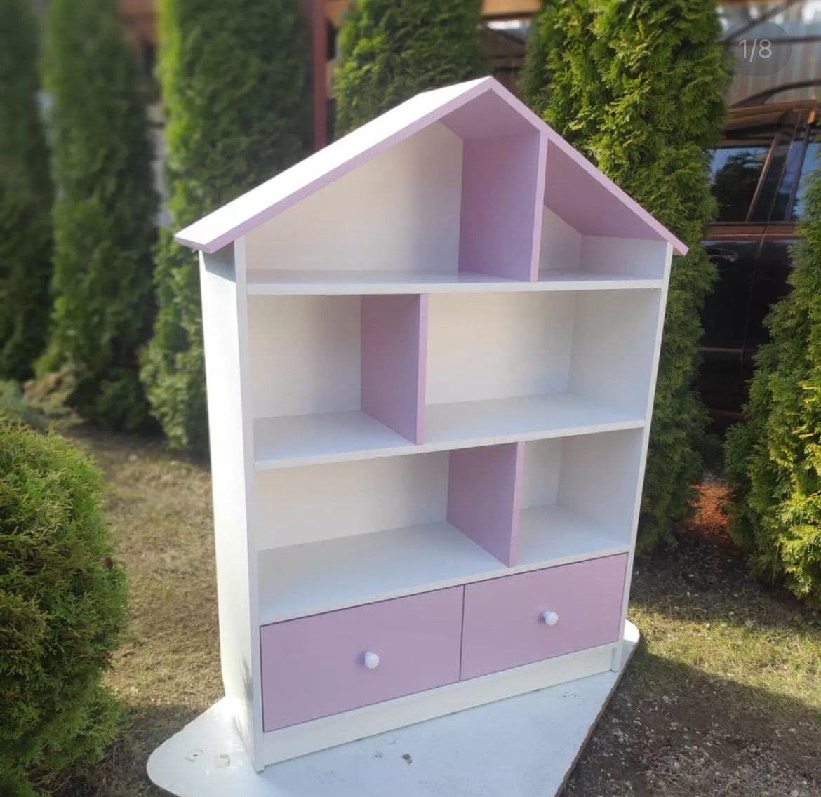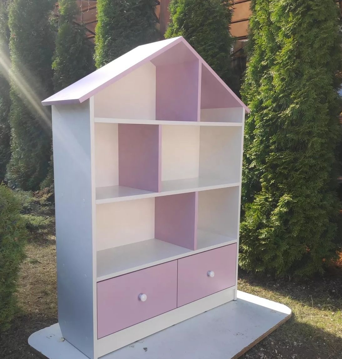 Домик-стеллаж с двумя выдвижными ящиками на шариковых направляющих полного выдвижения. Модель домика цельная.