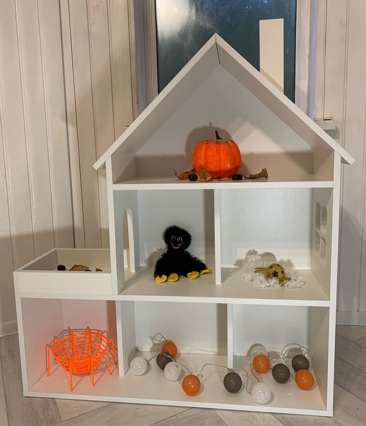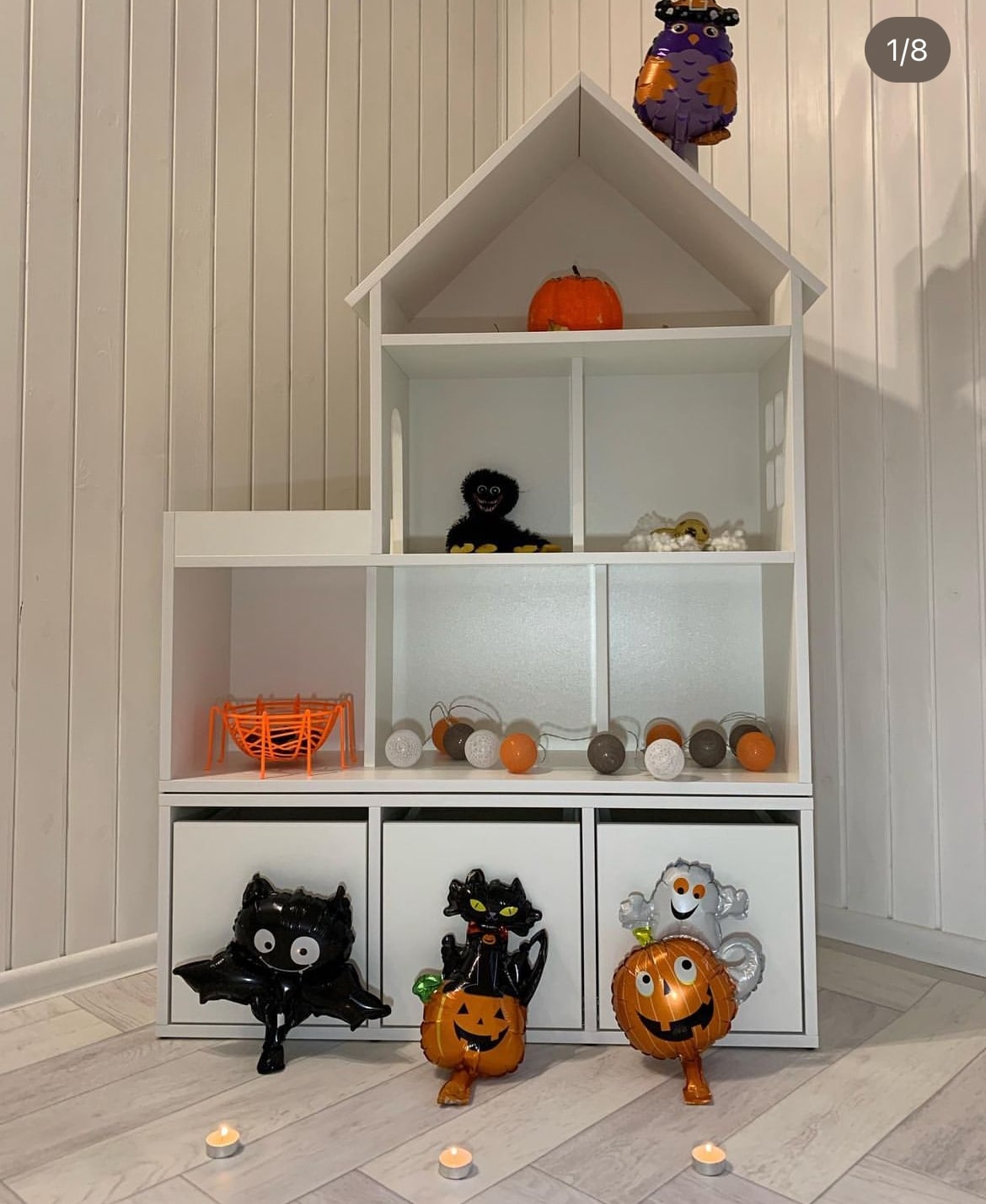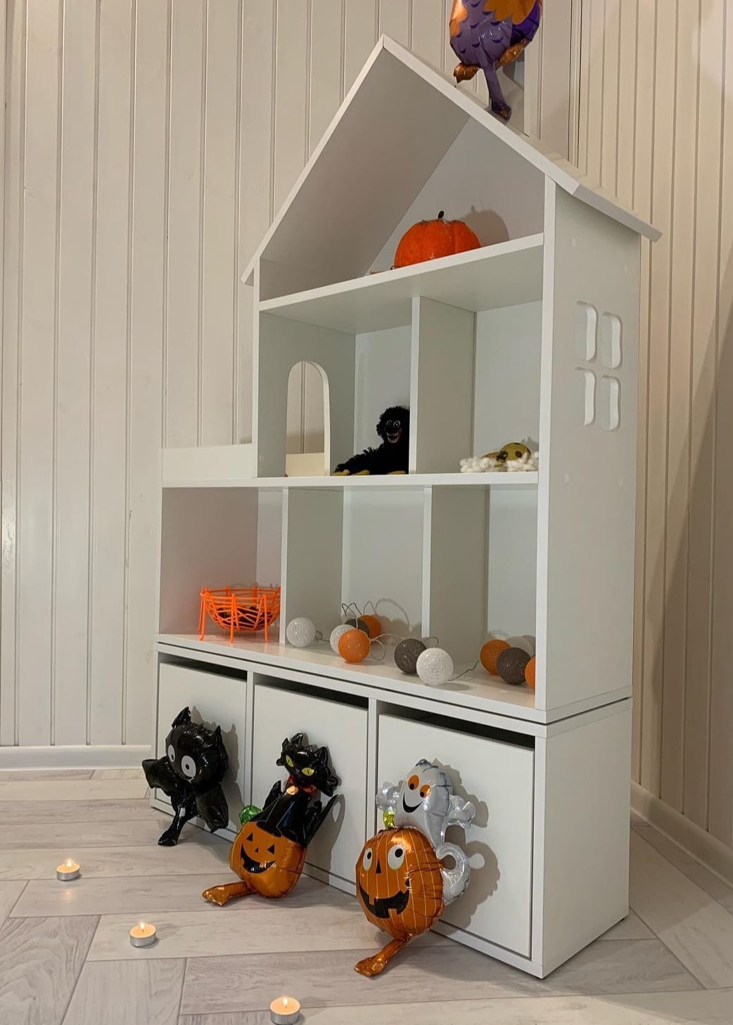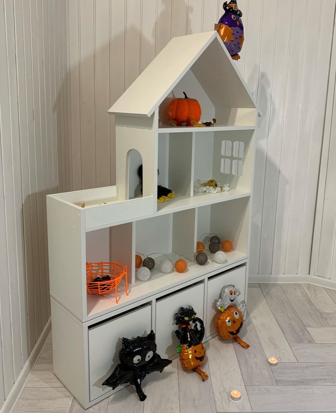 Домик-стеллаж состоит из двух частей, можно ставить как отдельно, так и один на один, в комплекте стяжки, для соединения двух частей. Балкончик можно сделать как слева, так и с правой стороны, как вам удобнее в интерьере.