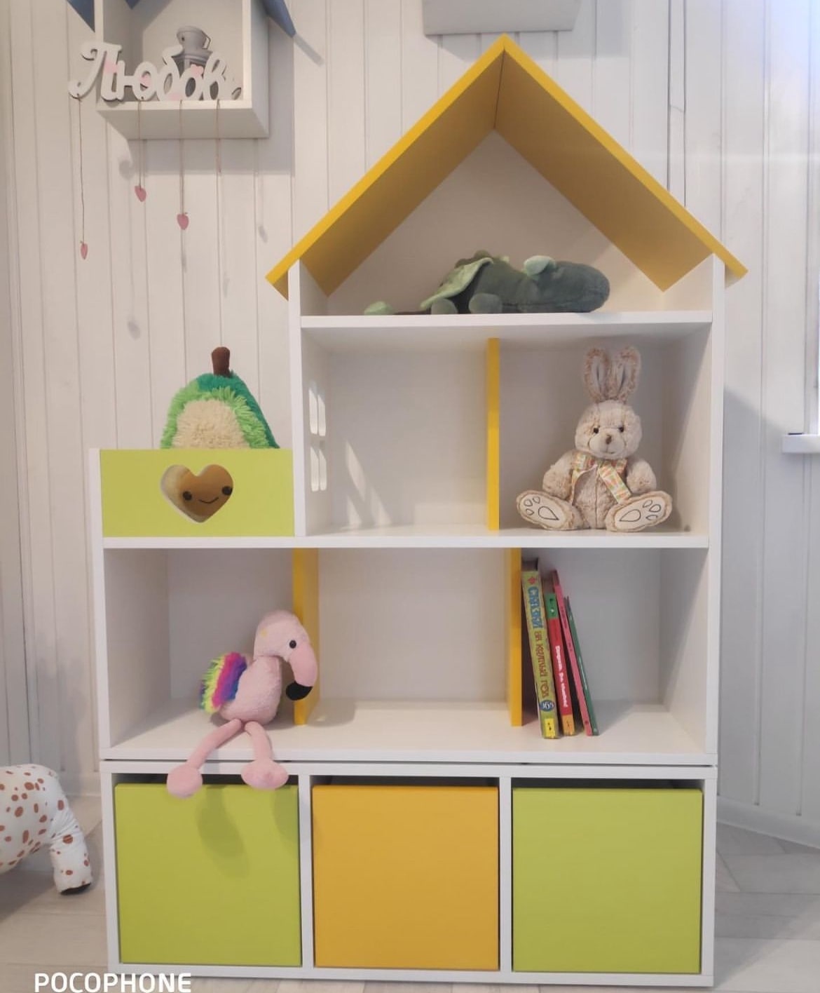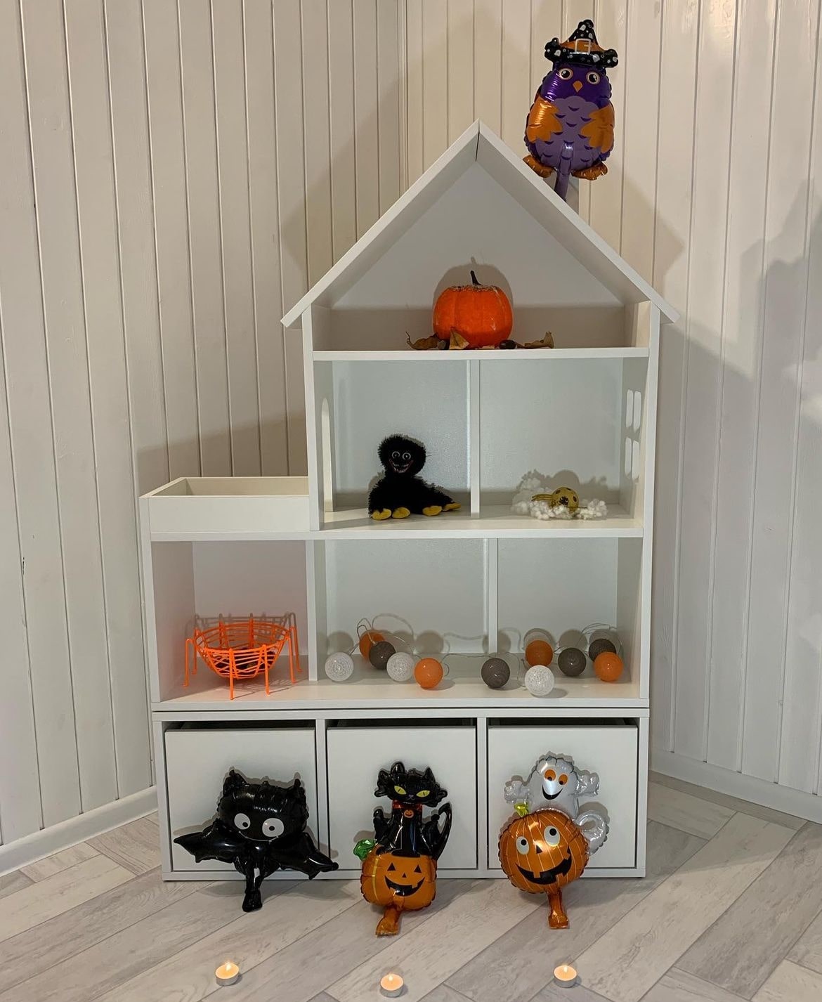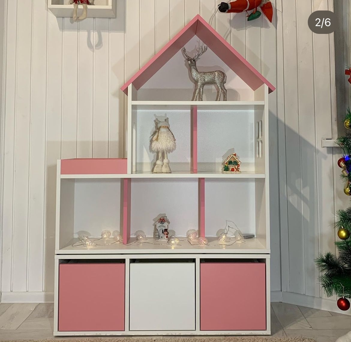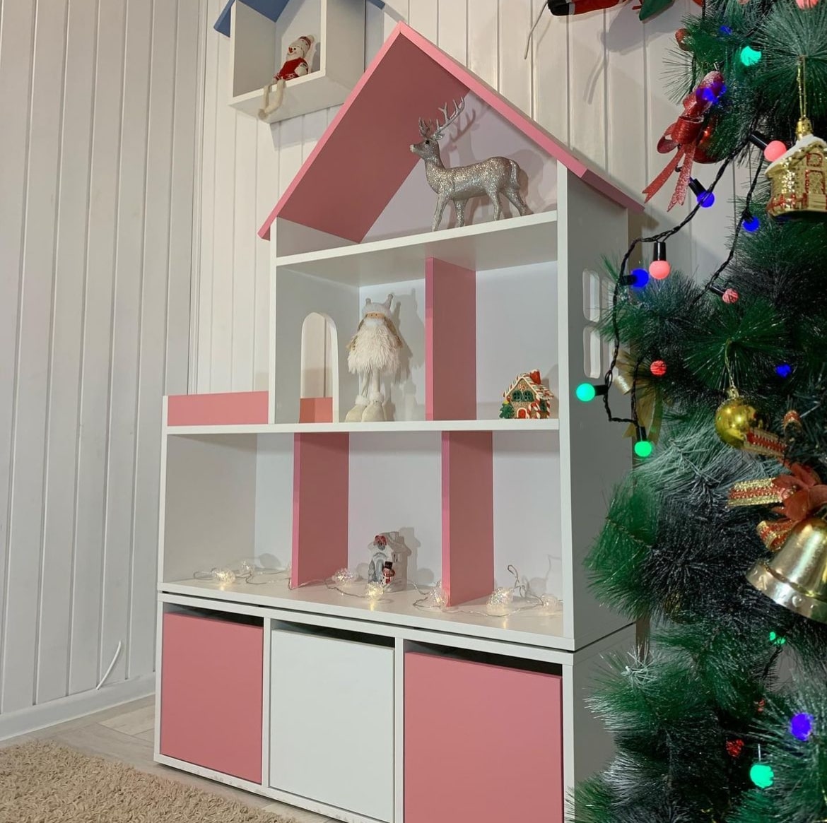 Домик-стеллаж состоит из двух частей, можно ставить как отдельно, так и один на один, в комплекте стяжки, для соединения двух частей. Балкончик можно сделать как слева, так и с правой стороны, как вам удобнее в интерьере.