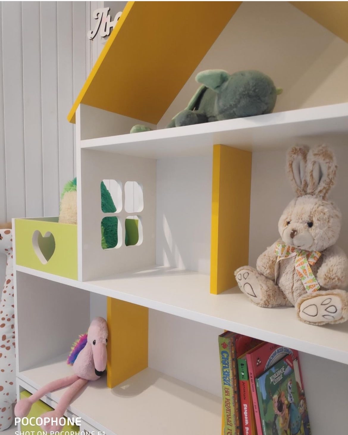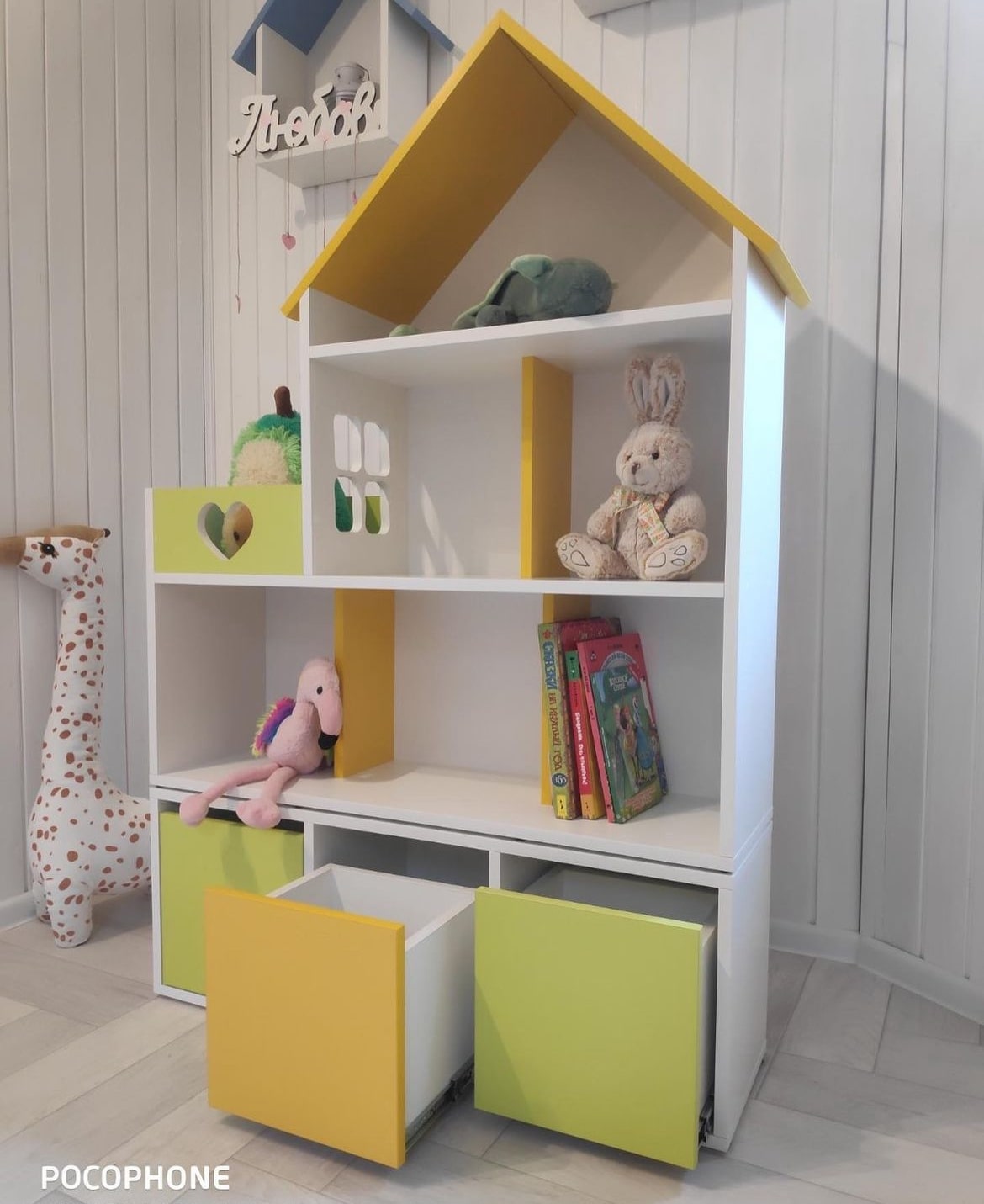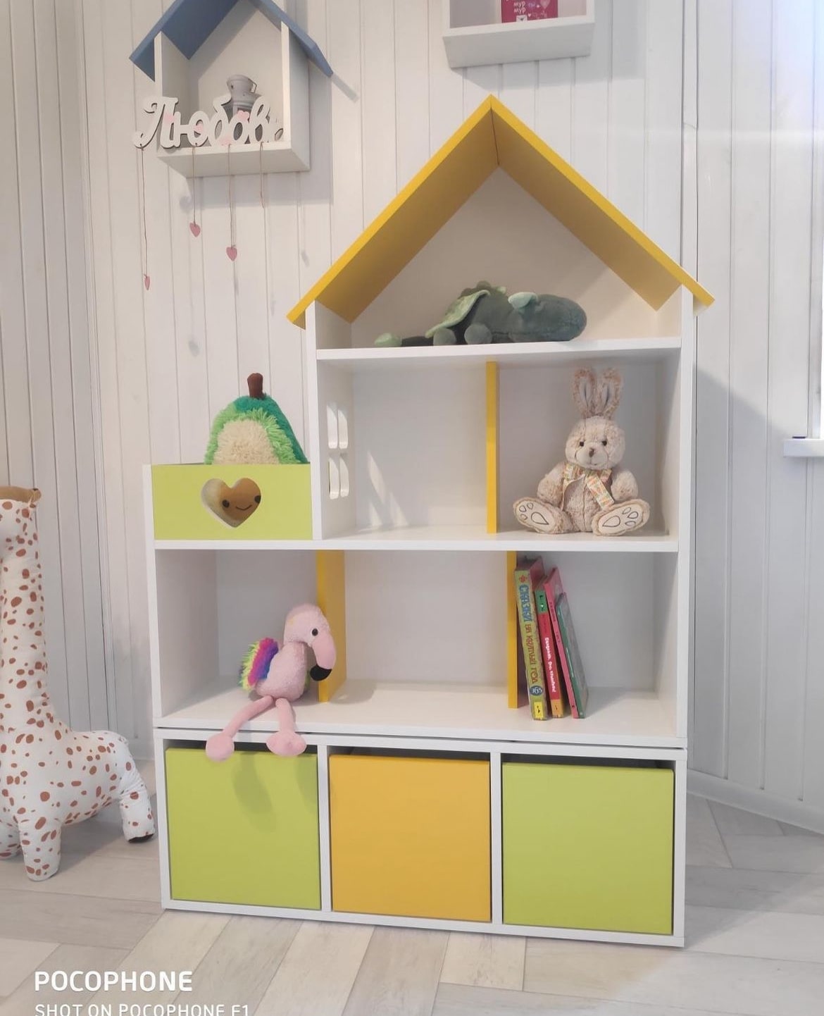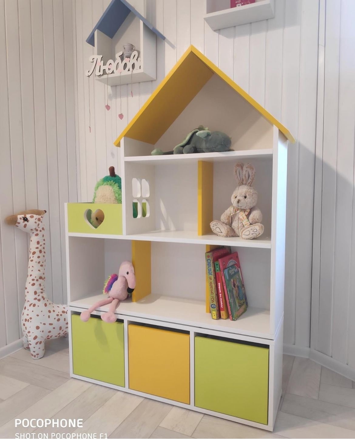 Домик-стеллаж состоит из двух частей, можно ставить как отдельно, так и один на один, в комплекте стяжки, для соединения двух частей. Балкончик можно сделать как слева, так и с правой стороны, как вам удобнее в интерьере.