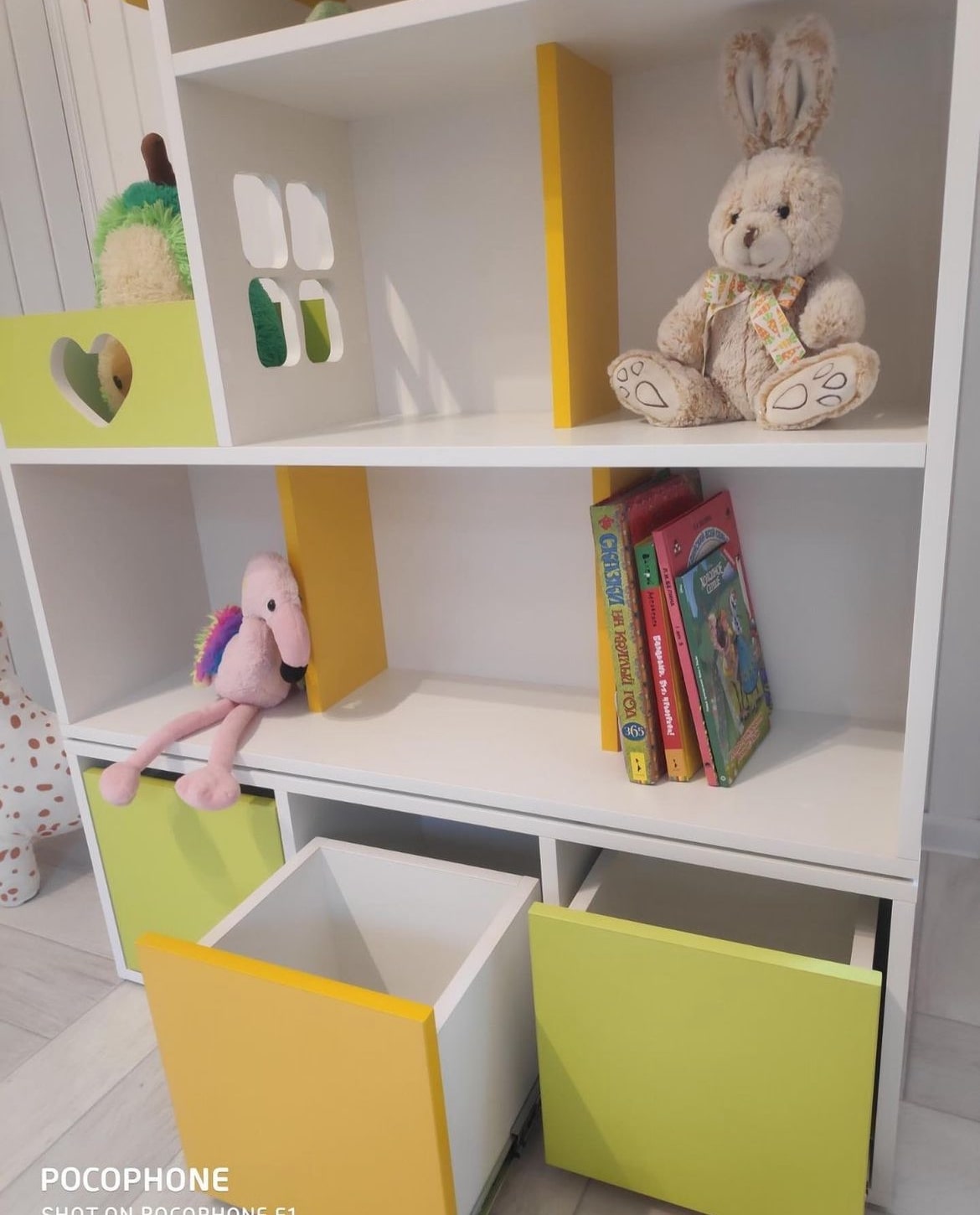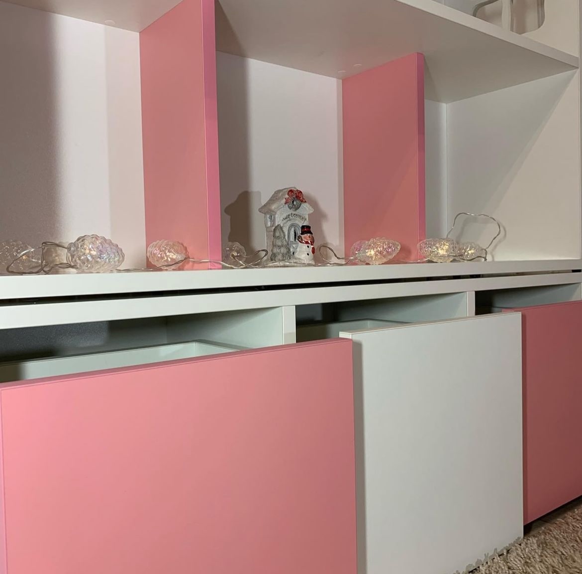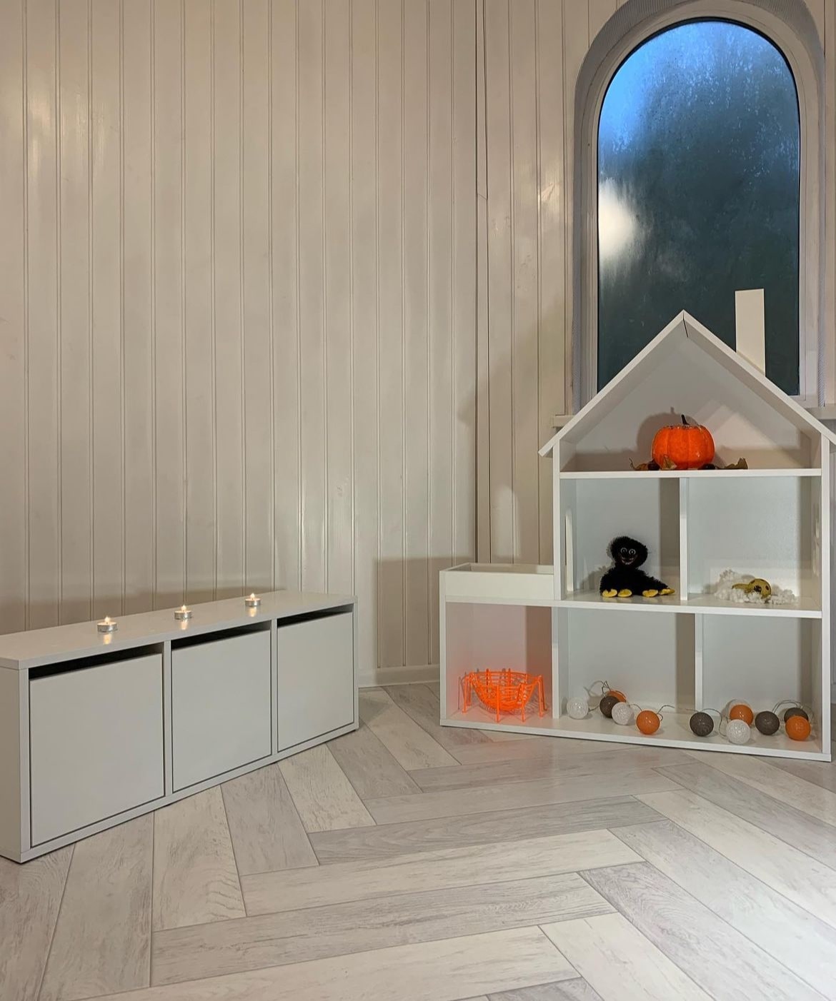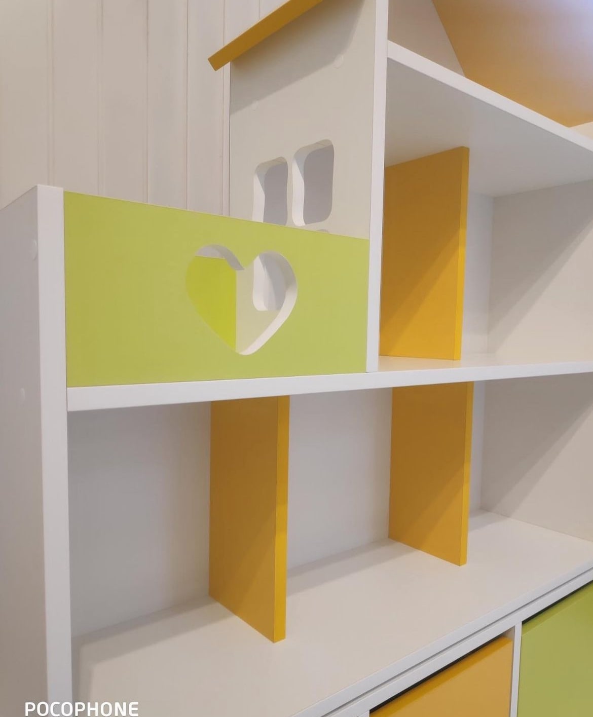 Домик-стеллаж состоит из двух частей, можно ставить как отдельно, так и один на один, в комплекте стяжки, для соединения двух частей. Балкончик можно сделать как слева, так и с правой стороны, как вам удобнее в интерьере.