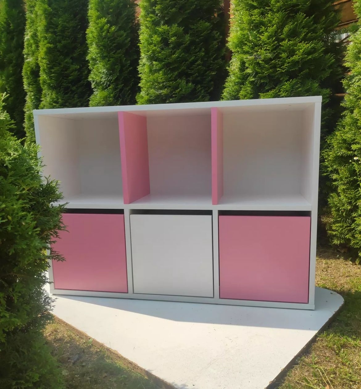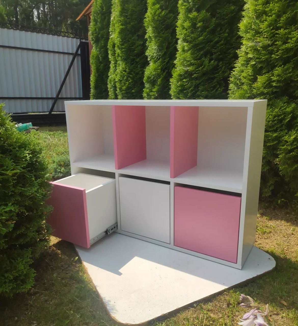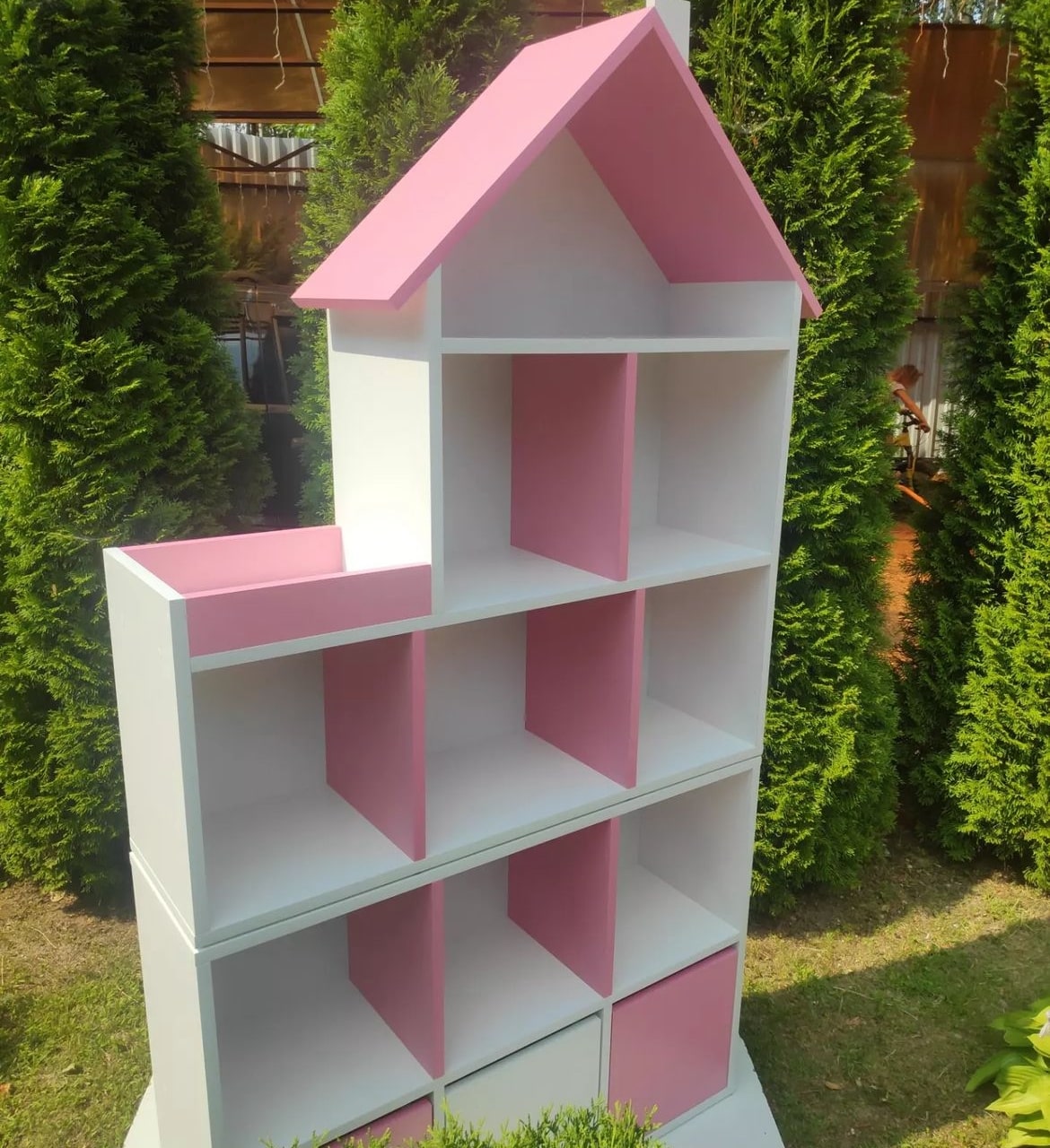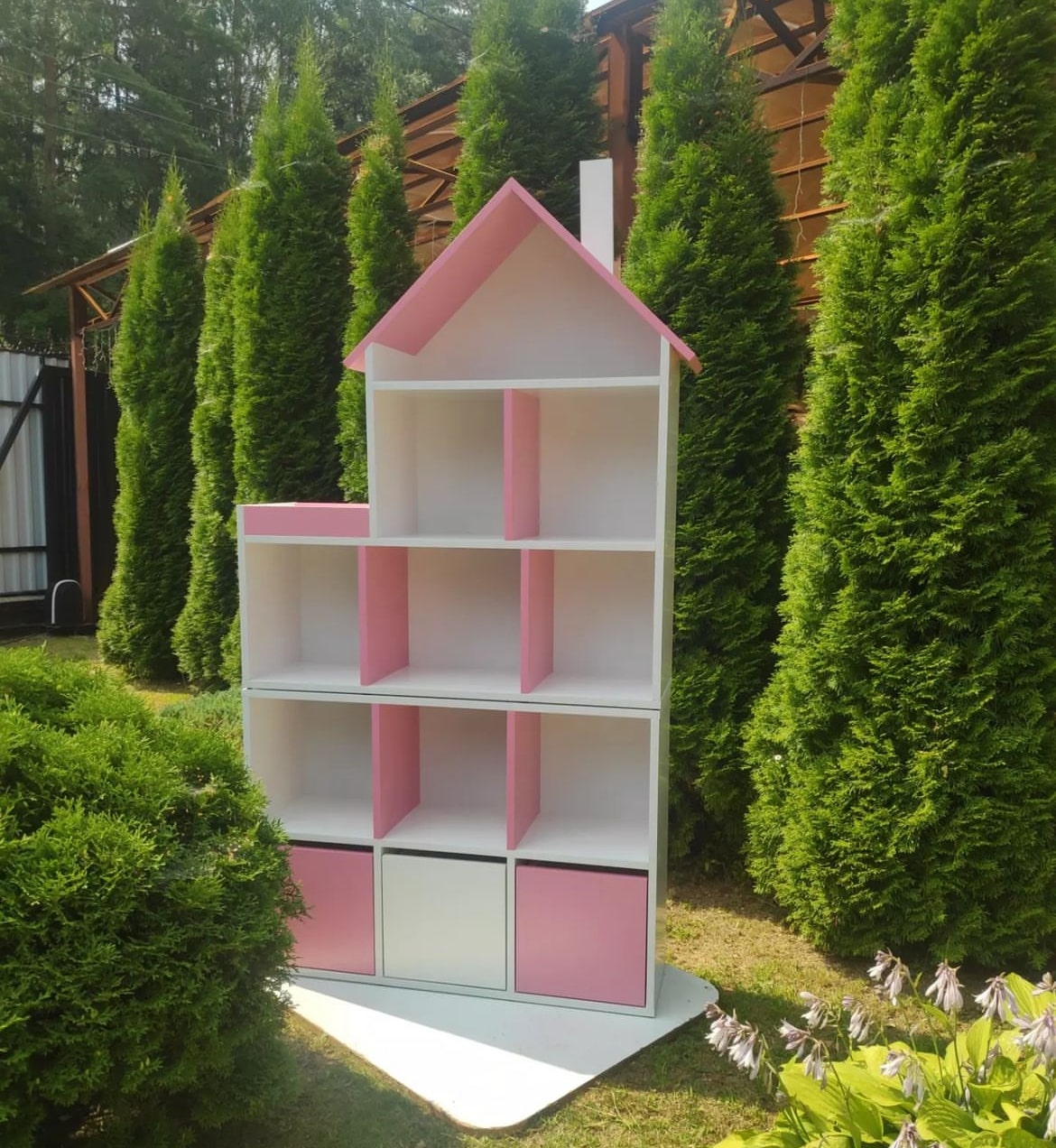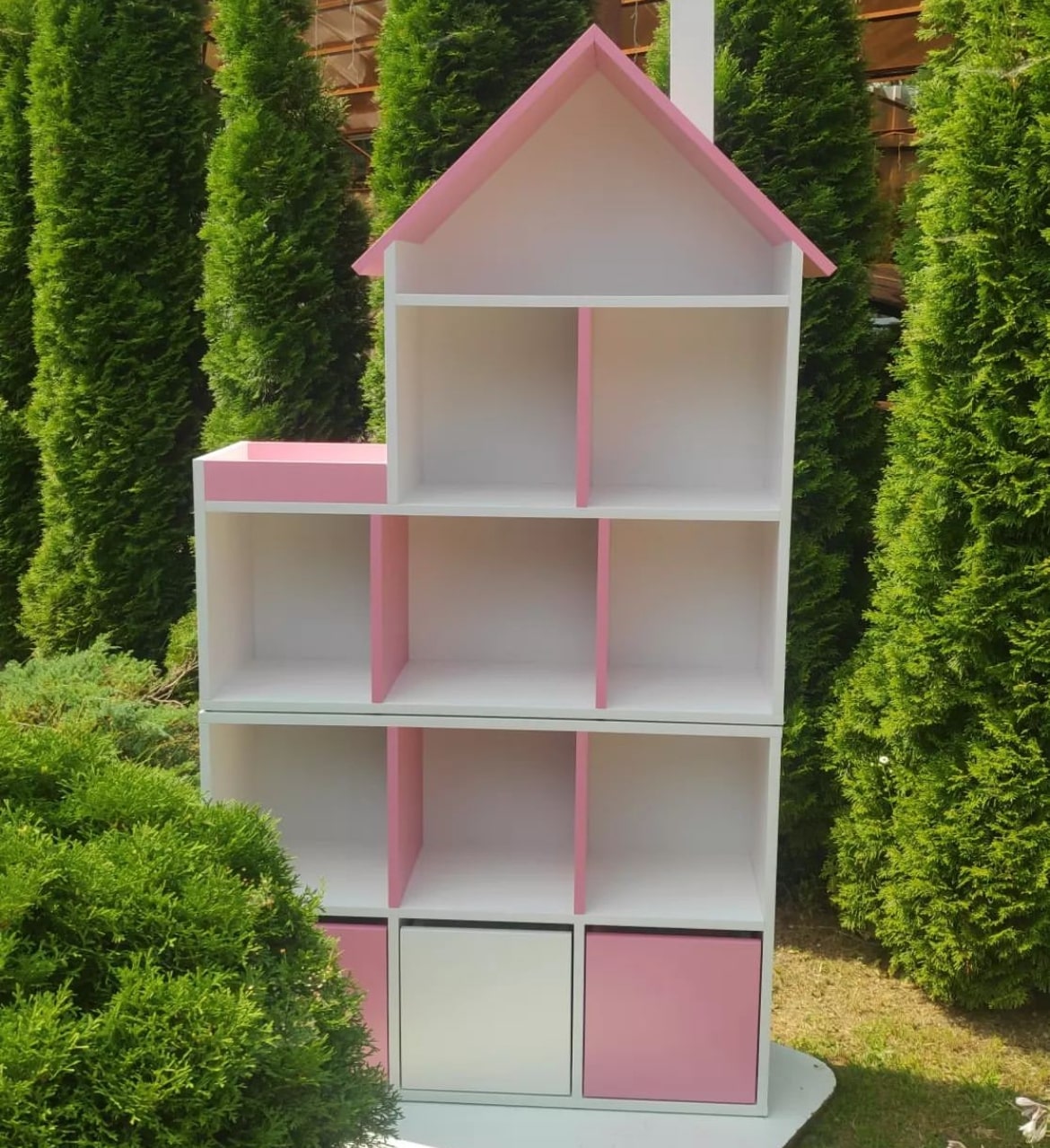 Домик-стеллаж состоит из двух частей, Можно ставить как отдельно, так и составлять один на один (сделаны специальные отверстия).