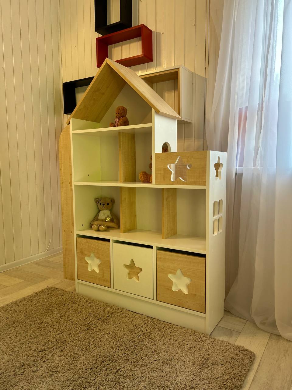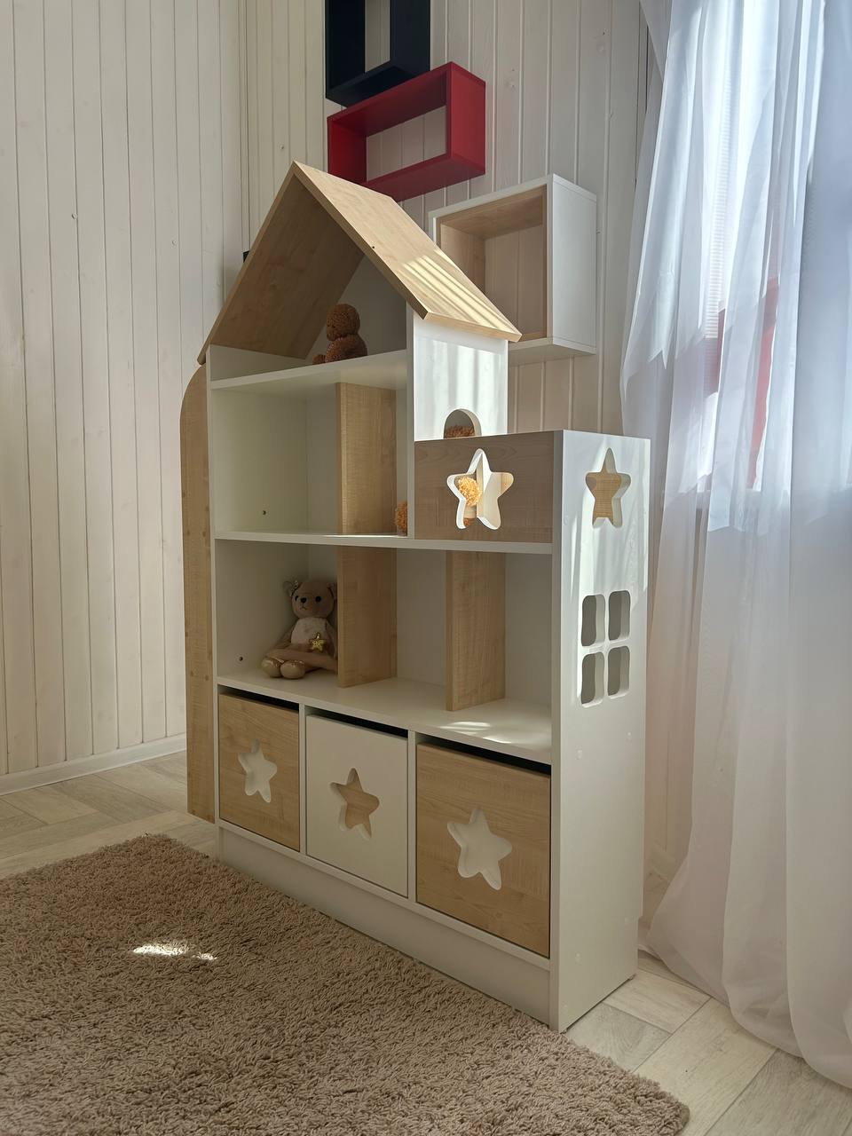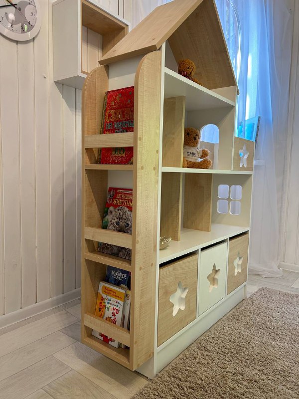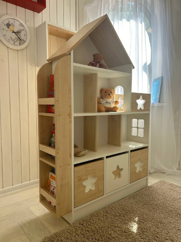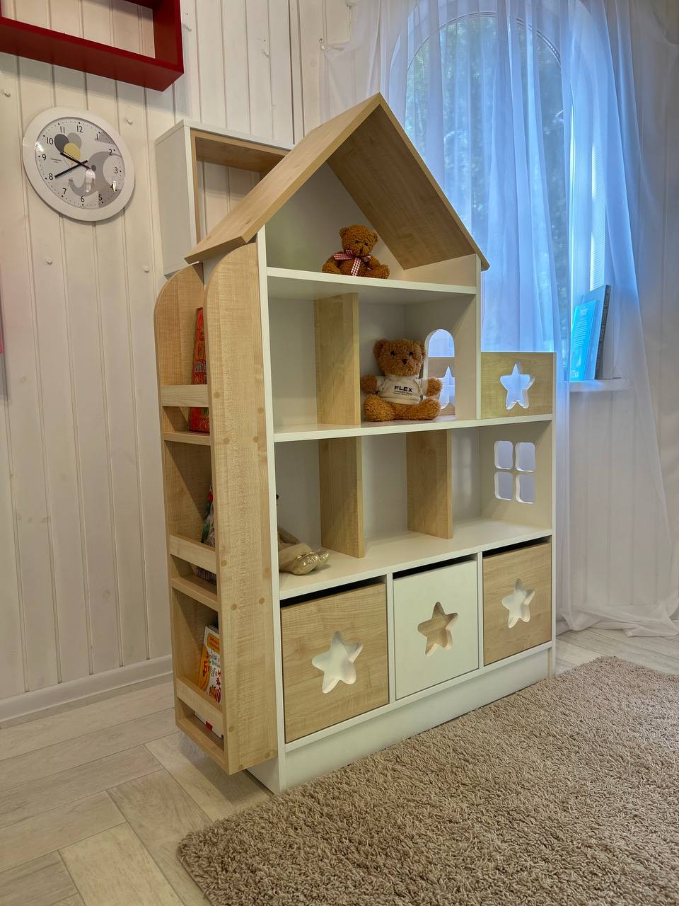 Детский домик для игрушек с боковой полочкой для книг! Красивый пример вариации того, как сотворить чудо-мебель в ваш детский интерьер ребенка. Что же можно хранить в таком большом изделии? -Куклы и кукольная мебель идеально подойдут для оформления комнат домика; -Мягкие игрушки, детские машинки, конструктор, интерактивные игрушки и многое другое можно комфортно расставить в свободные ячейки для поддержания порядка дома; -коробки для хранения вещей можно также вместить в свободные открытые ячейки; -в боковую полочку ваш ребенок сможет разместить все любимые книги и сказки.