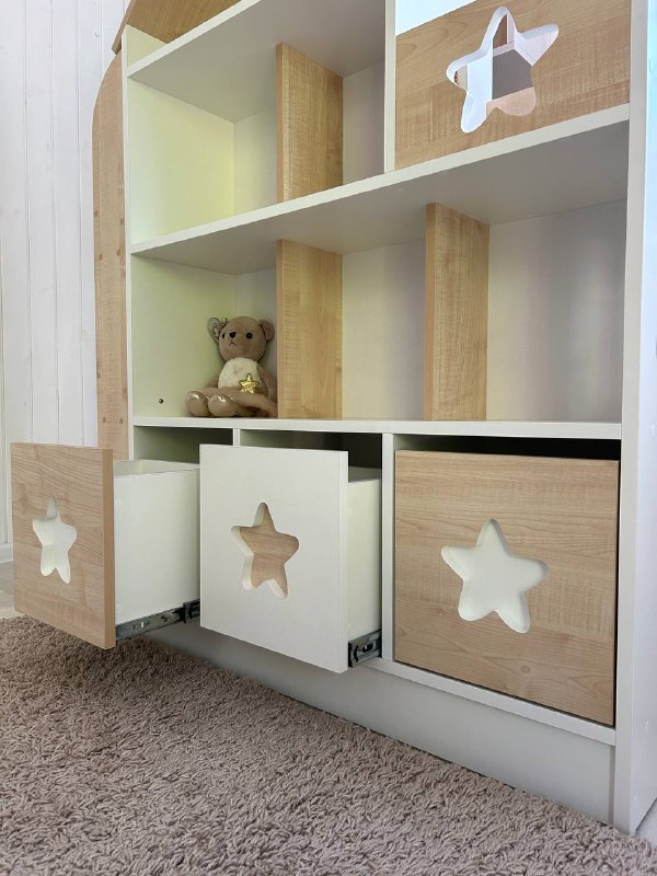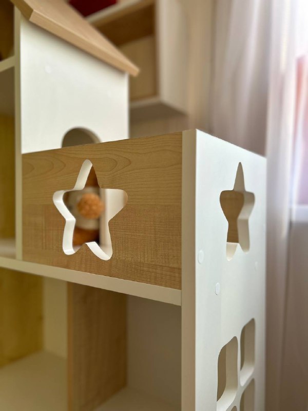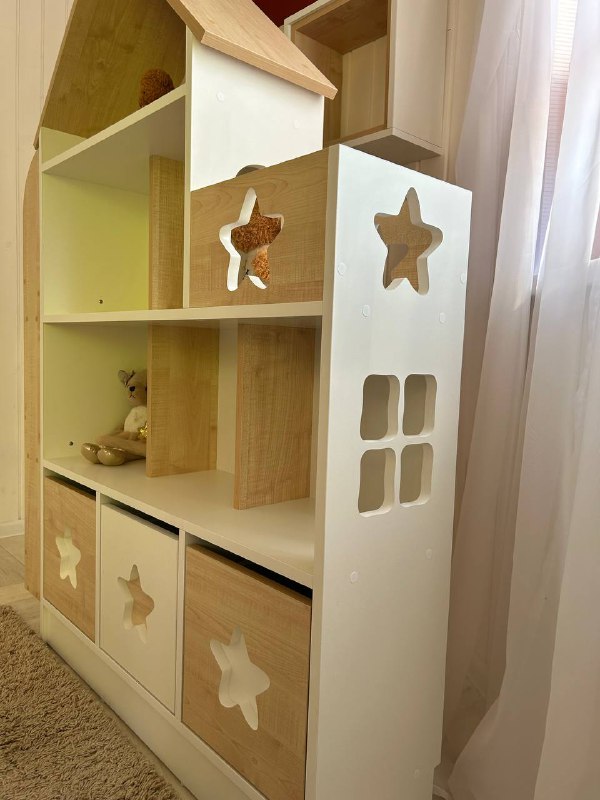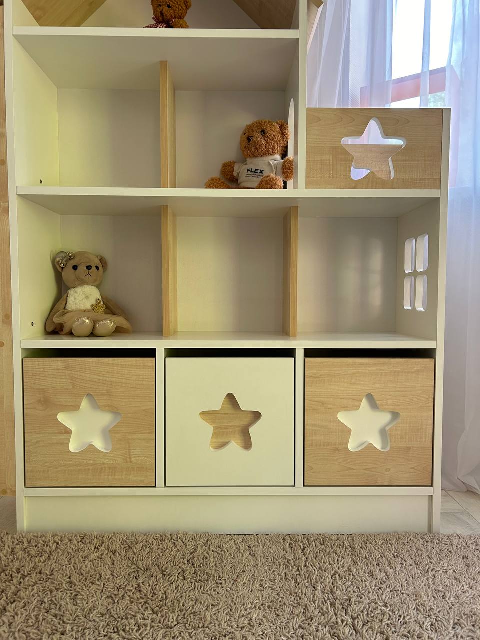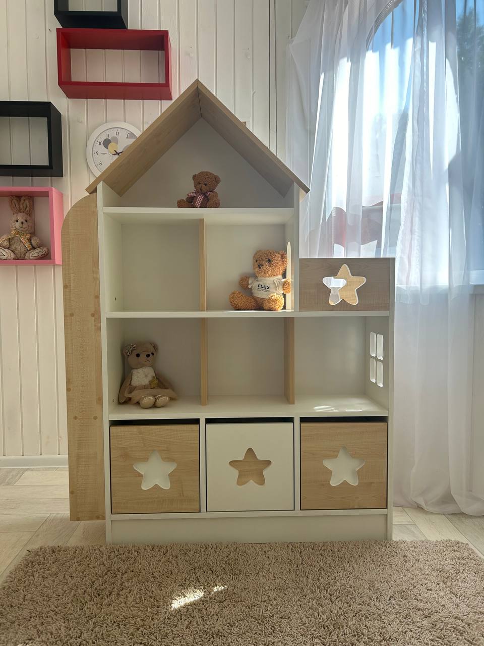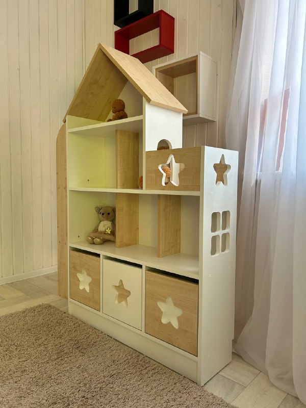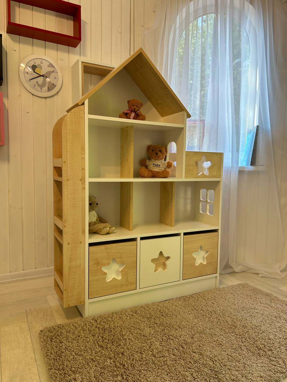 Детский домик для игрушек с боковой полочкой для книг! Красивый пример вариации того, как сотворить чудо-мебель в ваш детский интерьер ребенка. Что же можно хранить в таком большом изделии? -Куклы и кукольная мебель идеально подойдут для оформления комнат домика; -Мягкие игрушки, детские машинки, конструктор, интерактивные игрушки и многое другое можно комфортно расставить в свободные ячейки для поддержания порядка дома; -коробки для хранения вещей можно также вместить в свободные открытые ячейки; -в боковую полочку ваш ребенок сможет разместить все любимые книги и сказки.