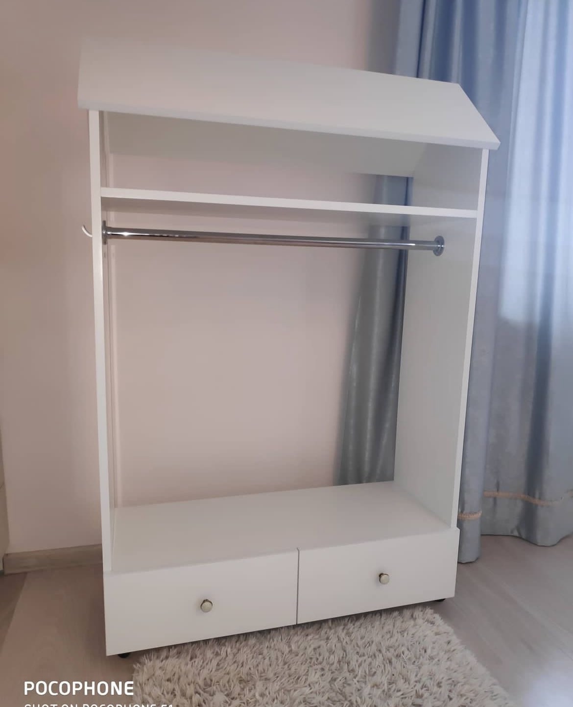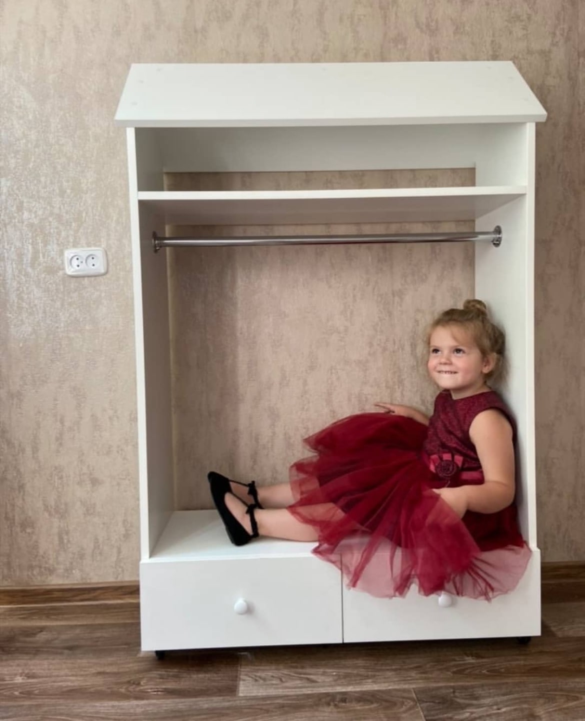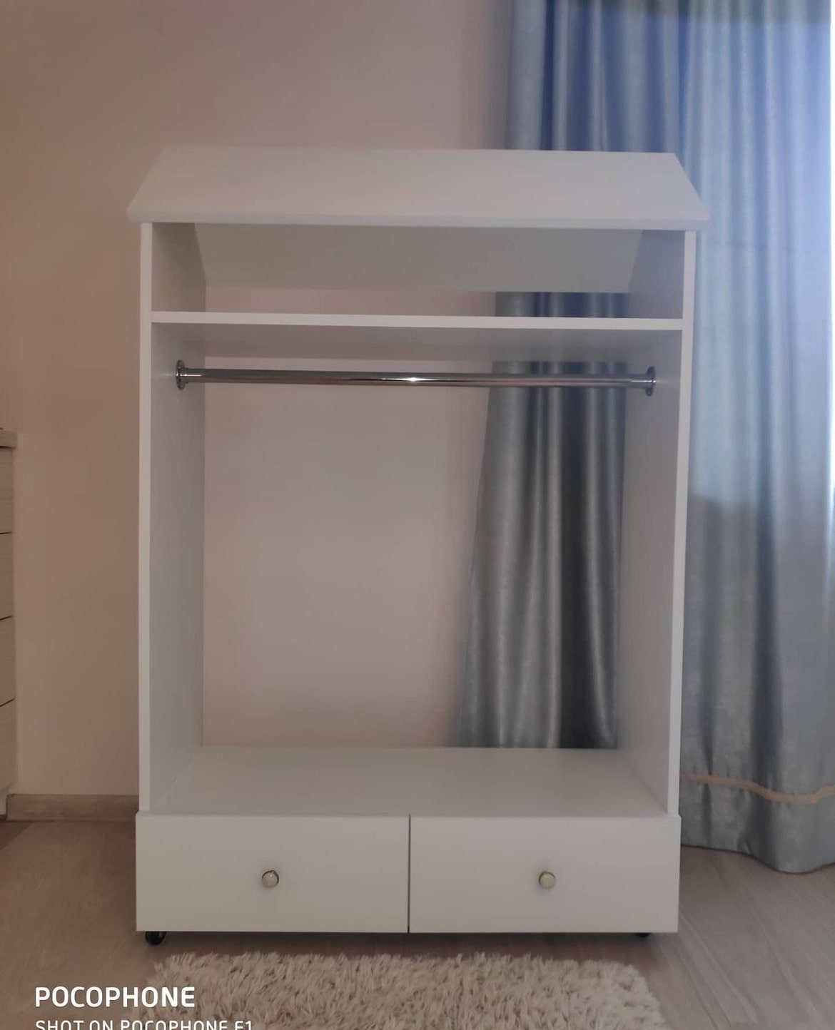 Компактный "шкаф" на колесиках, что очень удобно - можно легко передвигать. Внизу две шуфляды, и вверху полочка для аксессуаров.