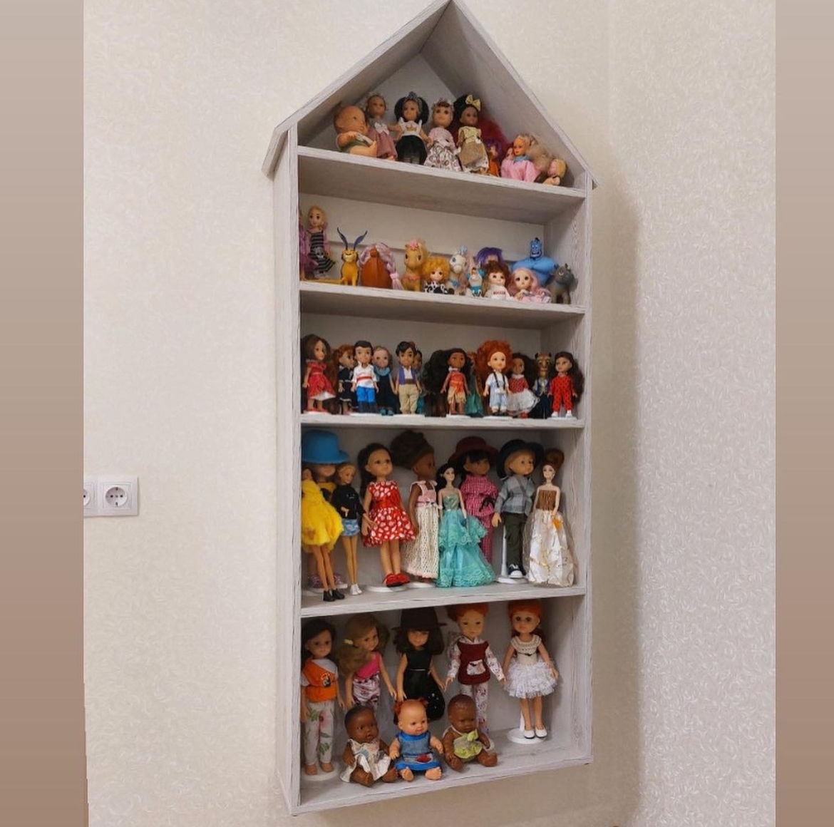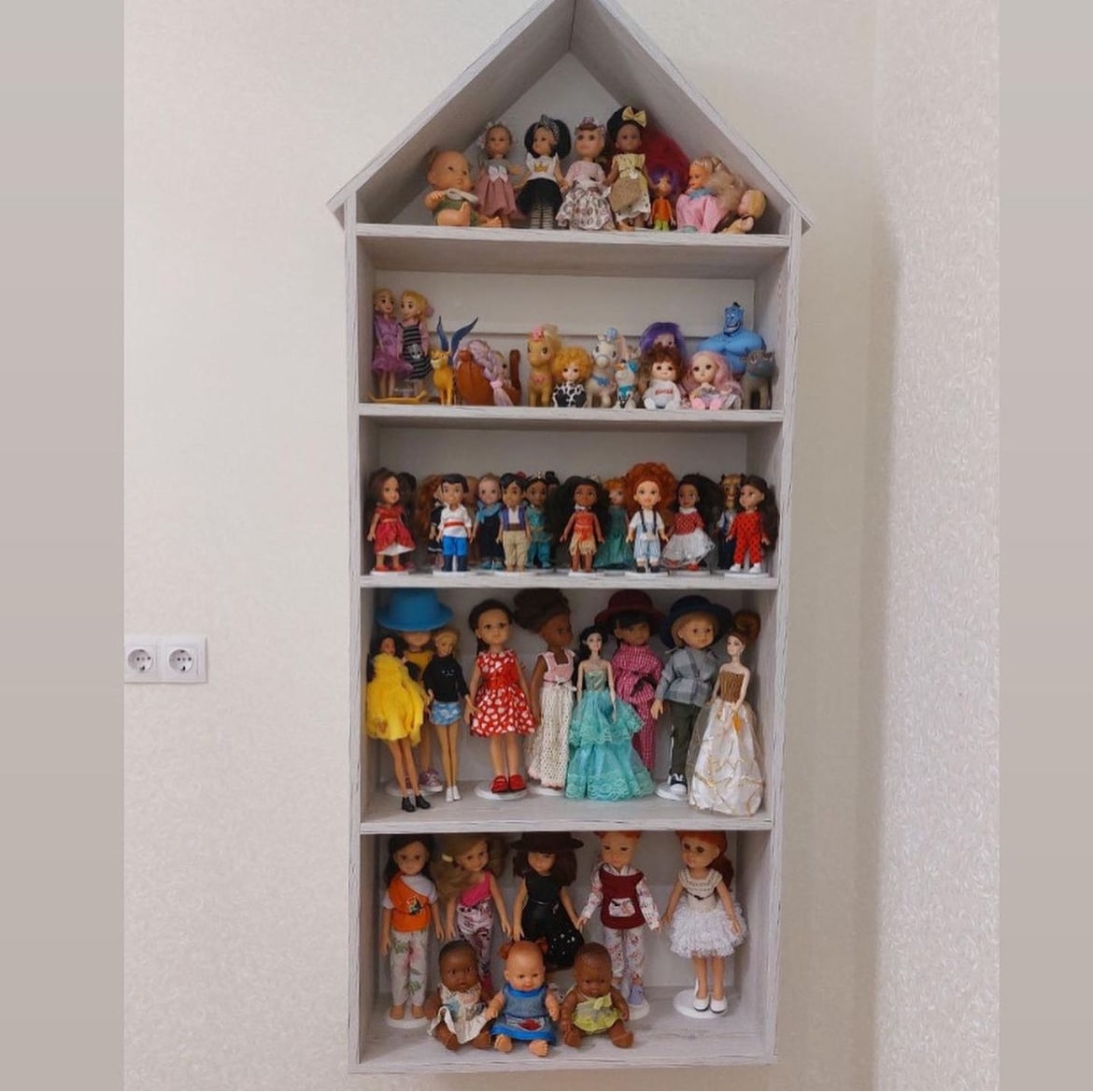 Если у вас очень много кукол, и хочется оставить память, можно изготовить под них полочку, и все игрушки будут на месте.