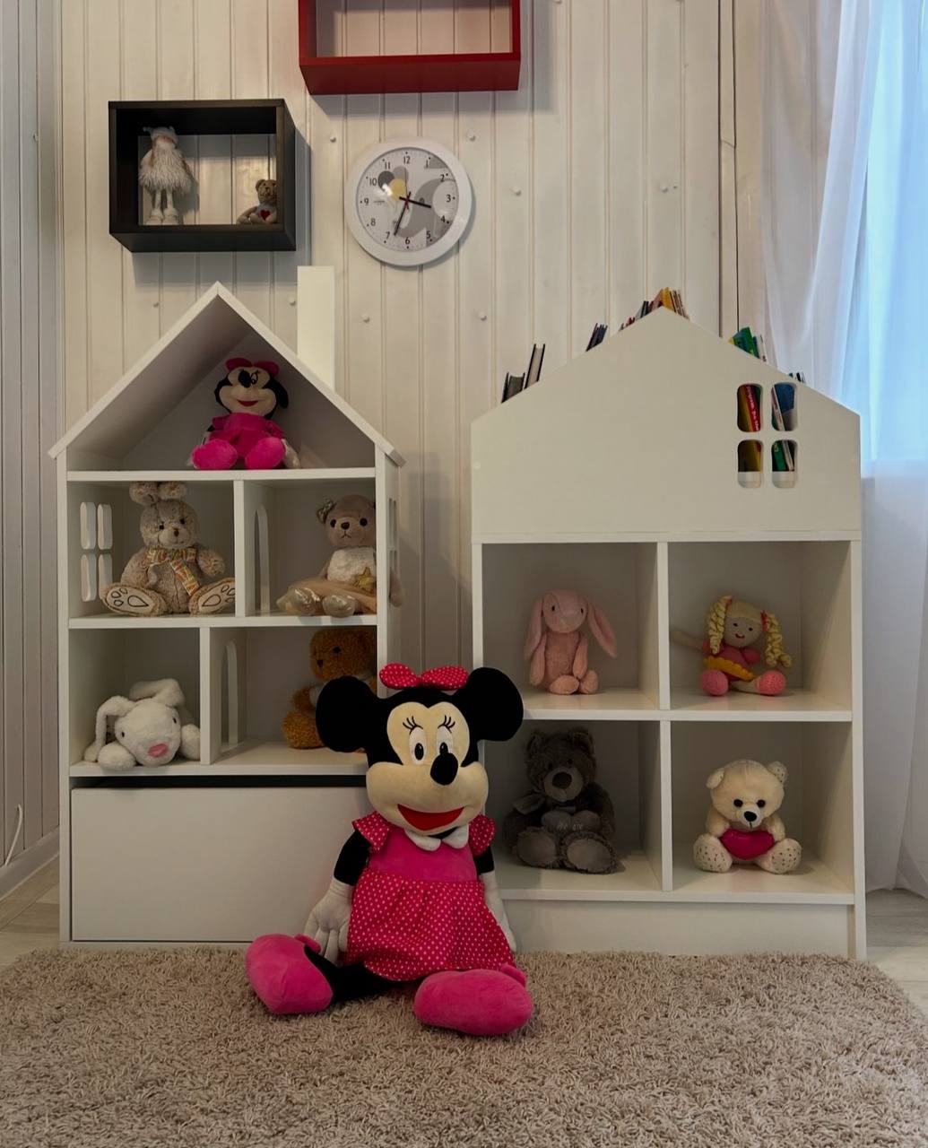 Размеры домика: высота 1230мм, ширина 600мм, глубина 280мм. Расстояние между полками по высоте 250мм. Размеры полки-стеллажа: высота 1154мм, ширина 680мм, глубина 300мм. Ячейки 300/313мм.