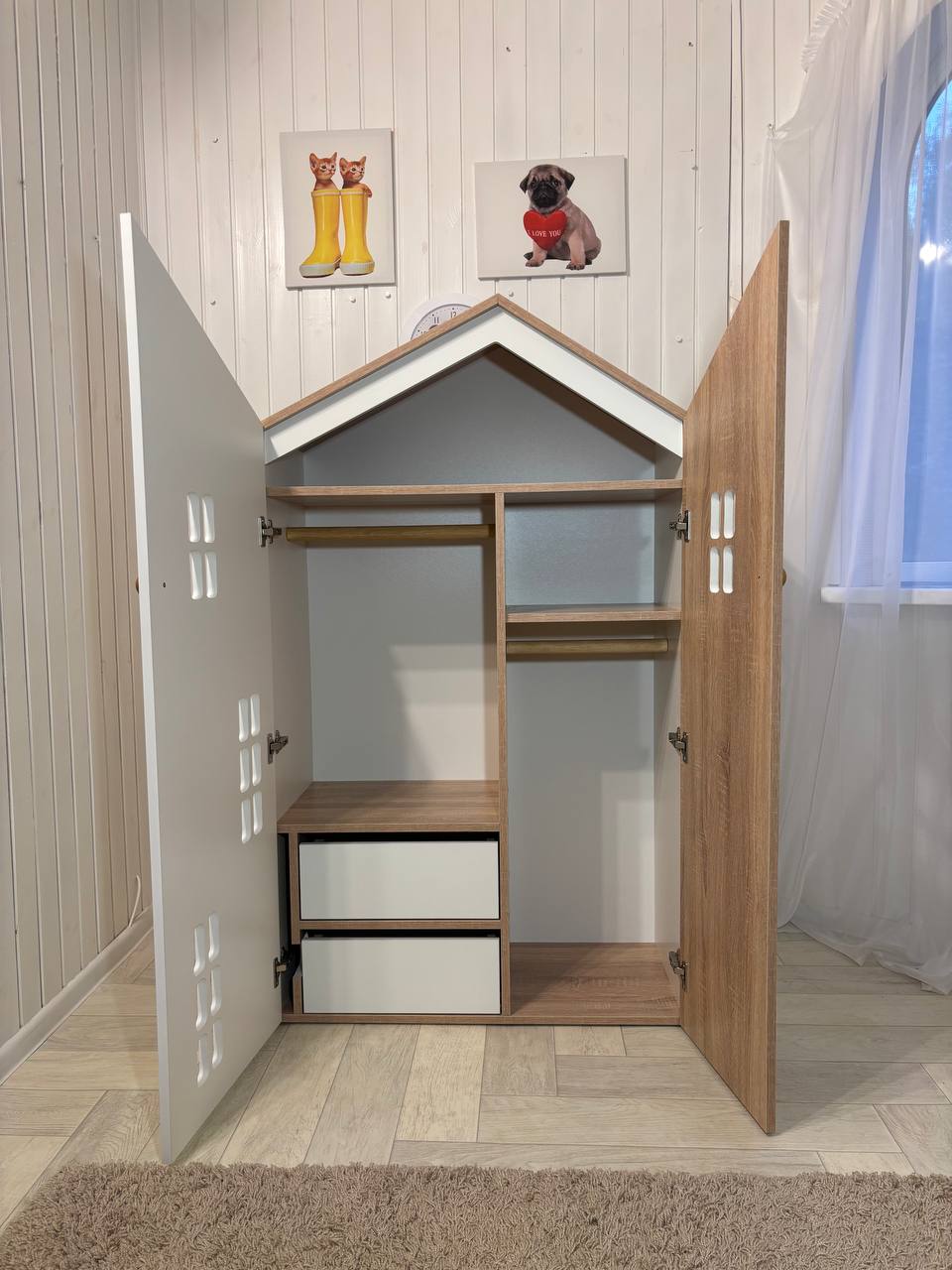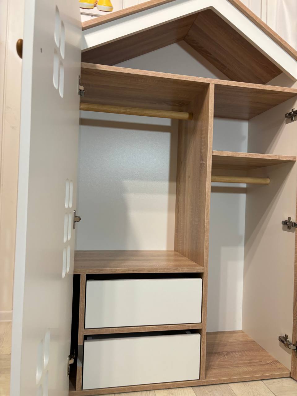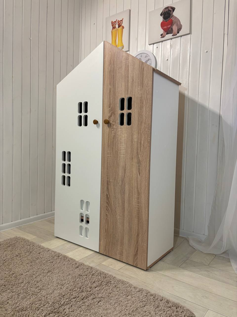 Шкаф в виде домика в детскую комнату идеально дополнит ваш интерьер. Функциональность шкафа не уступает его эстетике. Полки и ящики разнообразных размеров позволяют удобно разместить все необходимые вещи. Стильная модель шкафа выполнена в цвете белый + клён, внизу две шуфляды на шариковых направляющих полного выдвижения.