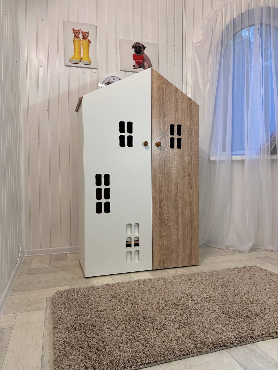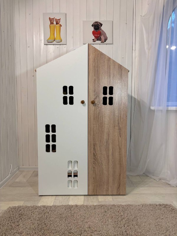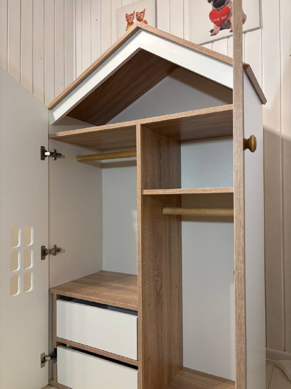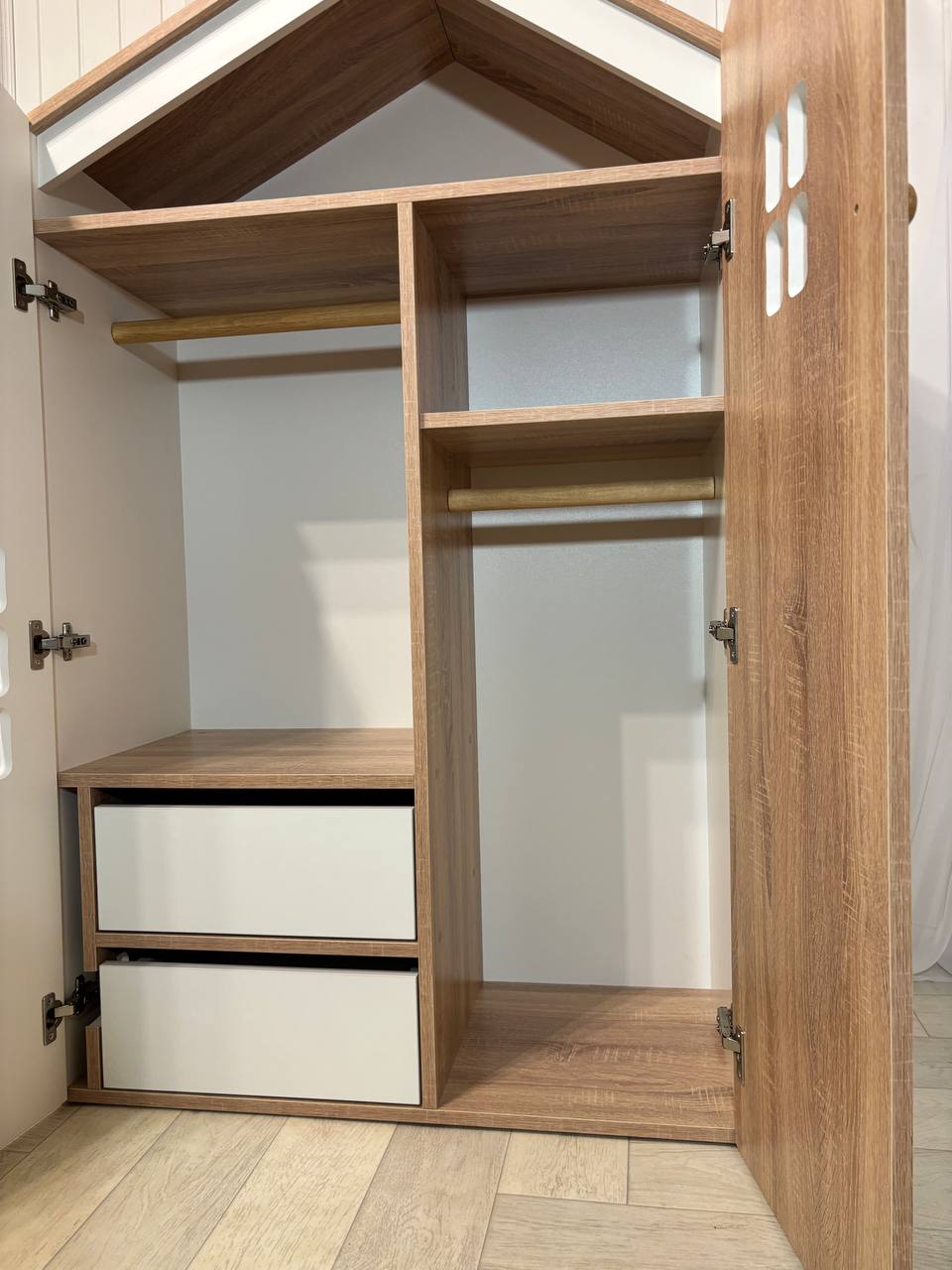 Шкаф в виде домика в детскую комнату идеально дополнит ваш интерьер. Функциональность шкафа не уступает его эстетике. Полки и ящики разнообразных размеров позволяют удобно разместить все необходимые вещи. Стильная модель шкафа выполнена в цвете белый + клён, внизу две шуфляды на шариковых направляющих полного выдвижения.