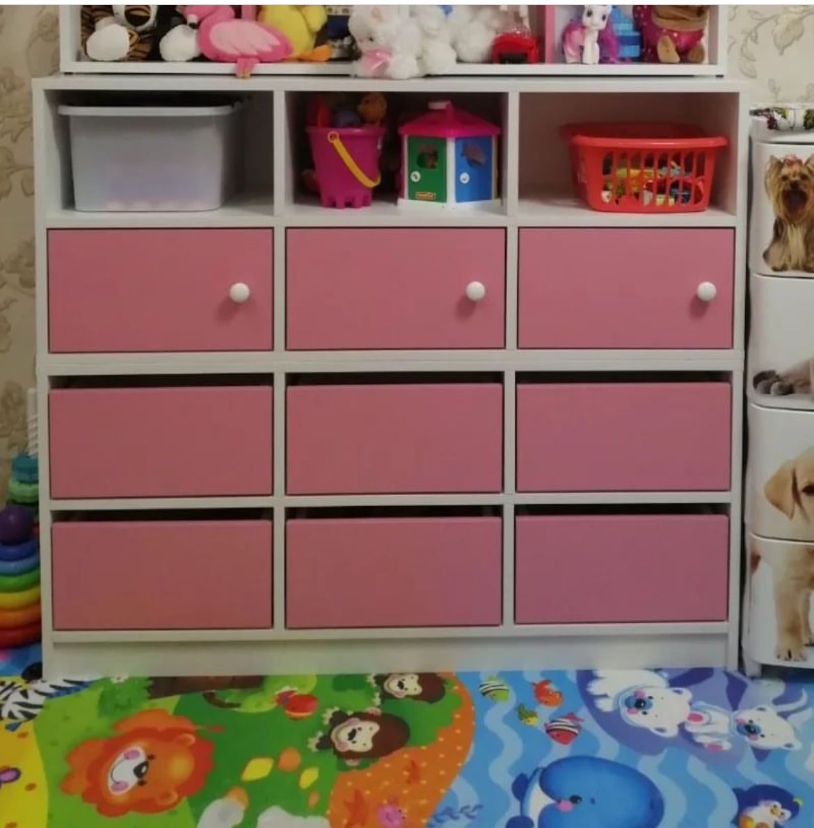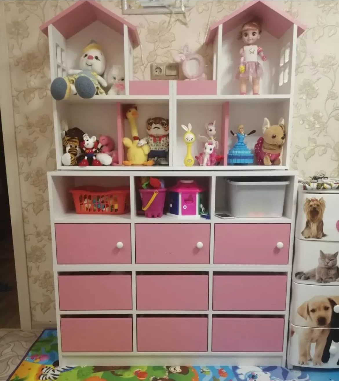 Стеллаж поможет поддерживать порядок, позволяя легко находить игрушки и книги. Открытые полки позволяют сделать игрушки видимыми, что способствует игре. Малыш сможет создавать свои истории, опираясь на доступные ему предметы.Стеллаж в детскую комнату для двух сестричек.
