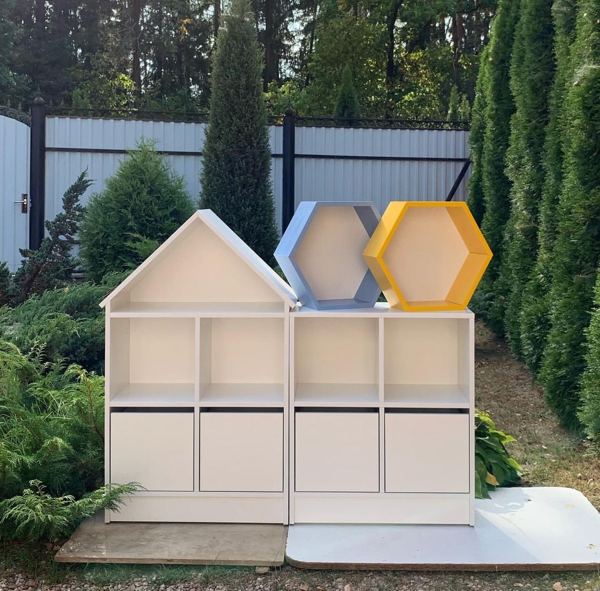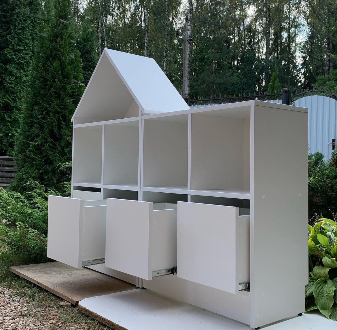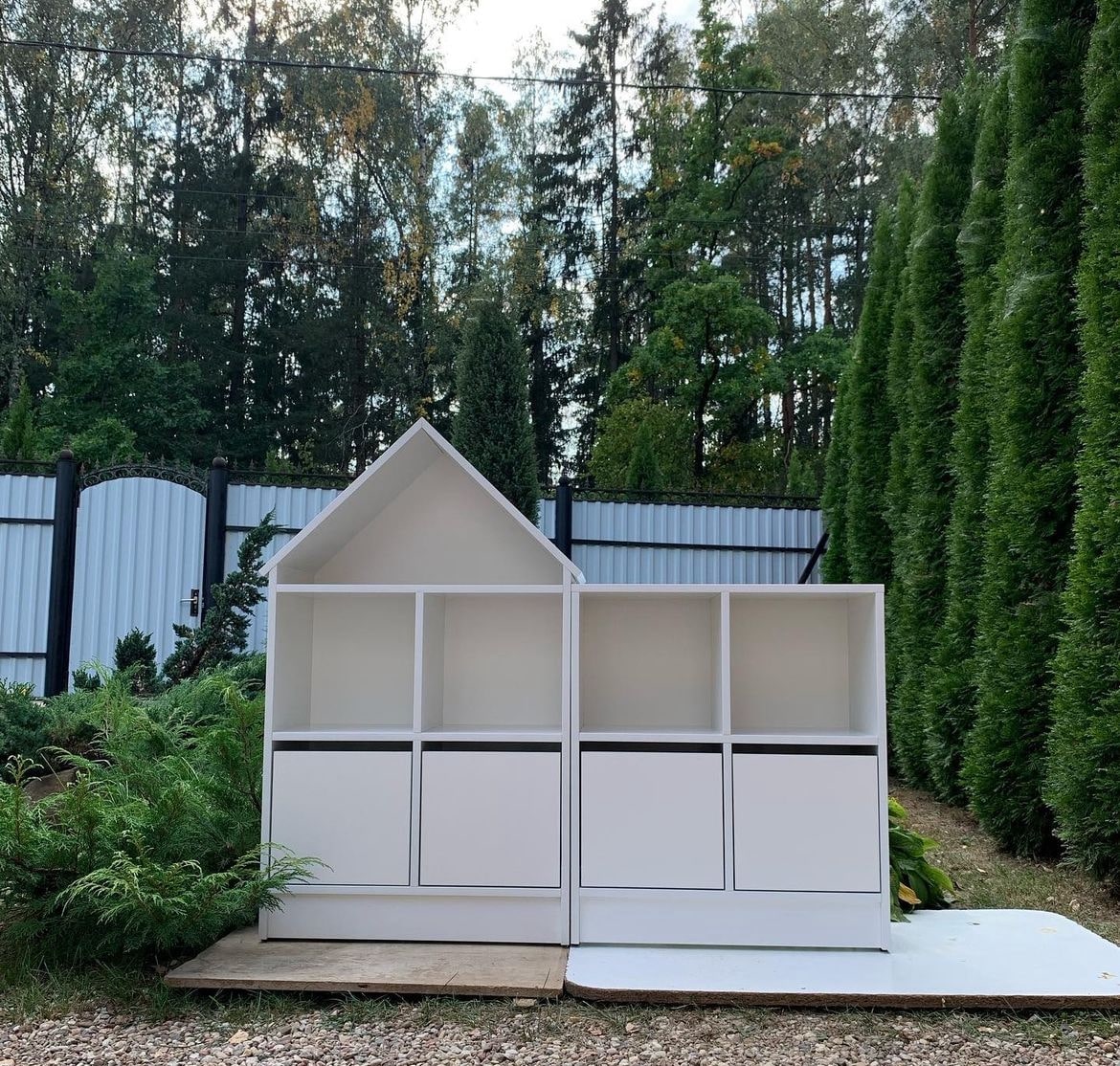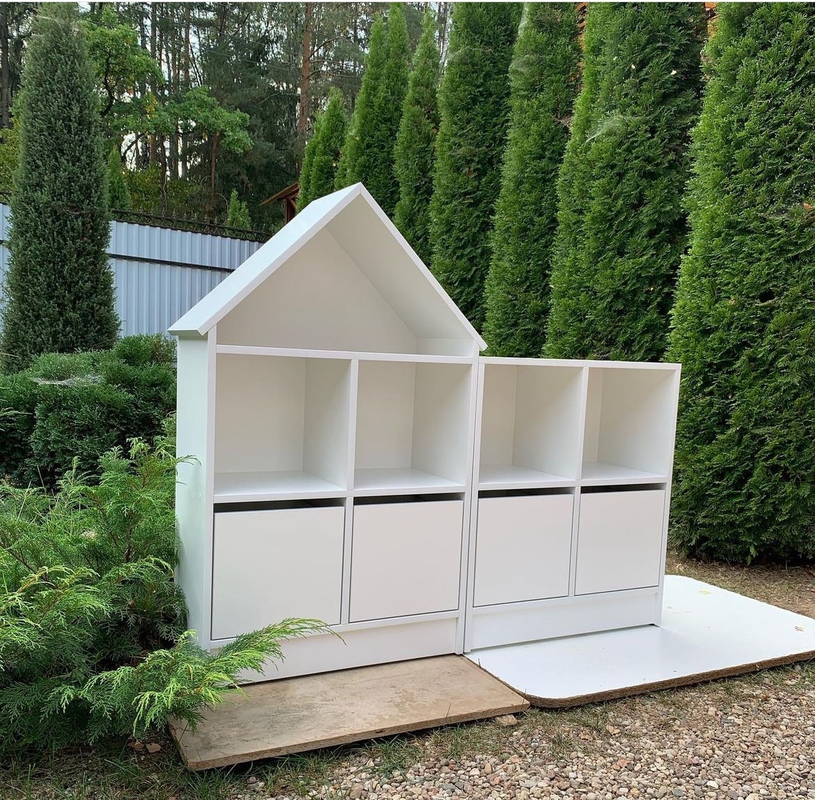 Размеры домика: высота 1195мм, ширина 694мм, глубина 320мм. Стеллаж: высота 805мм, ширина 694мм, глубина 320мм. Ячейки 320\320\320мм.