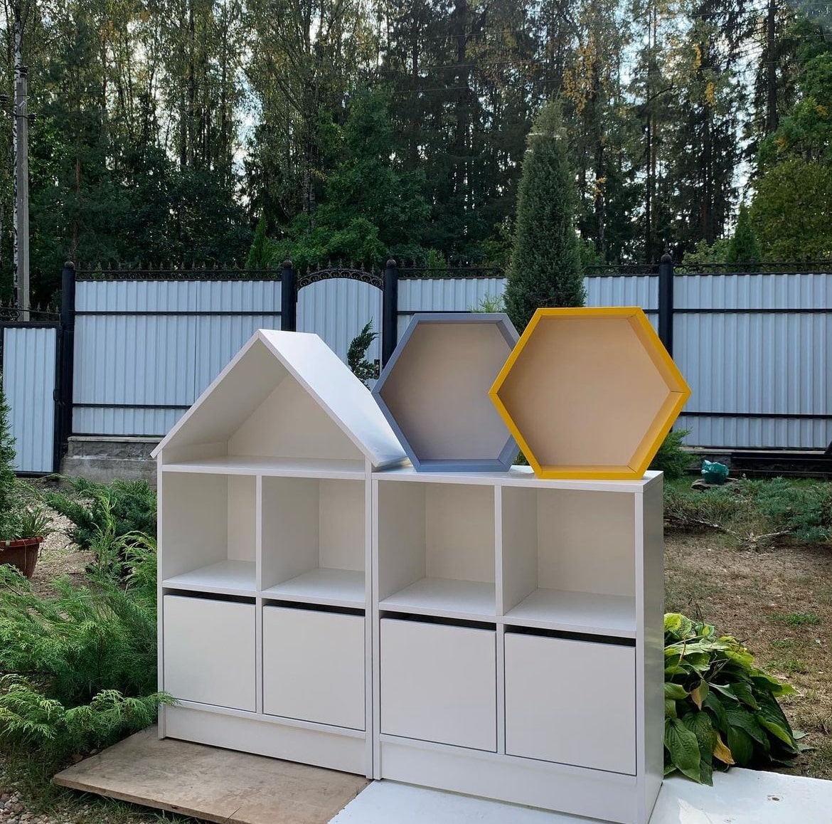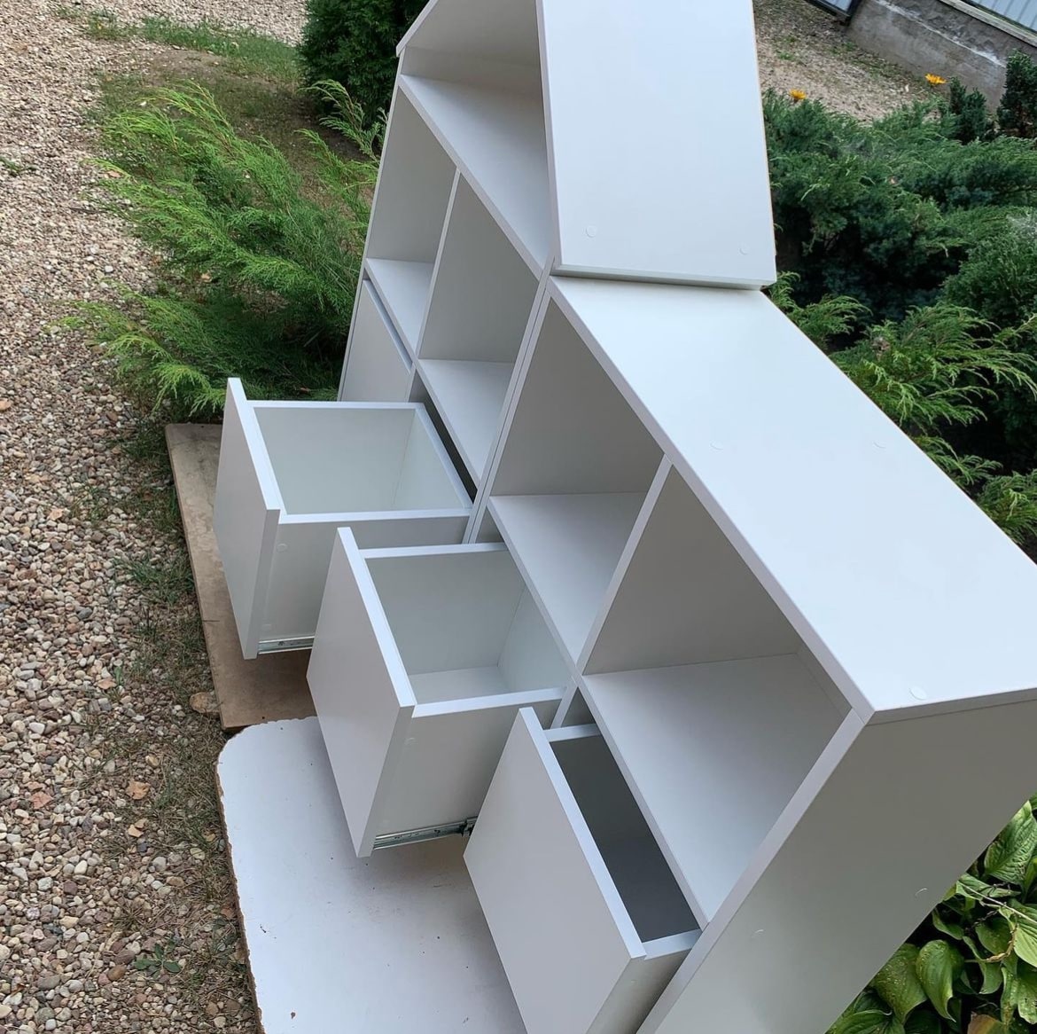 Стеллаж в виде домика с двумя шуфлядами, стеллаж на четыре ячейки с двумя шуфлядами.