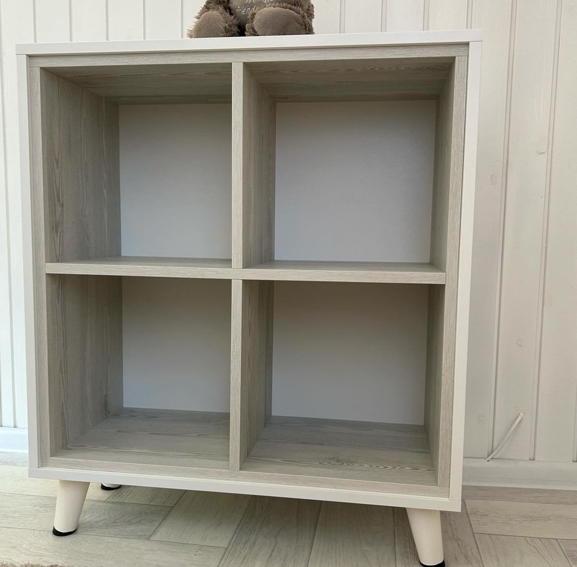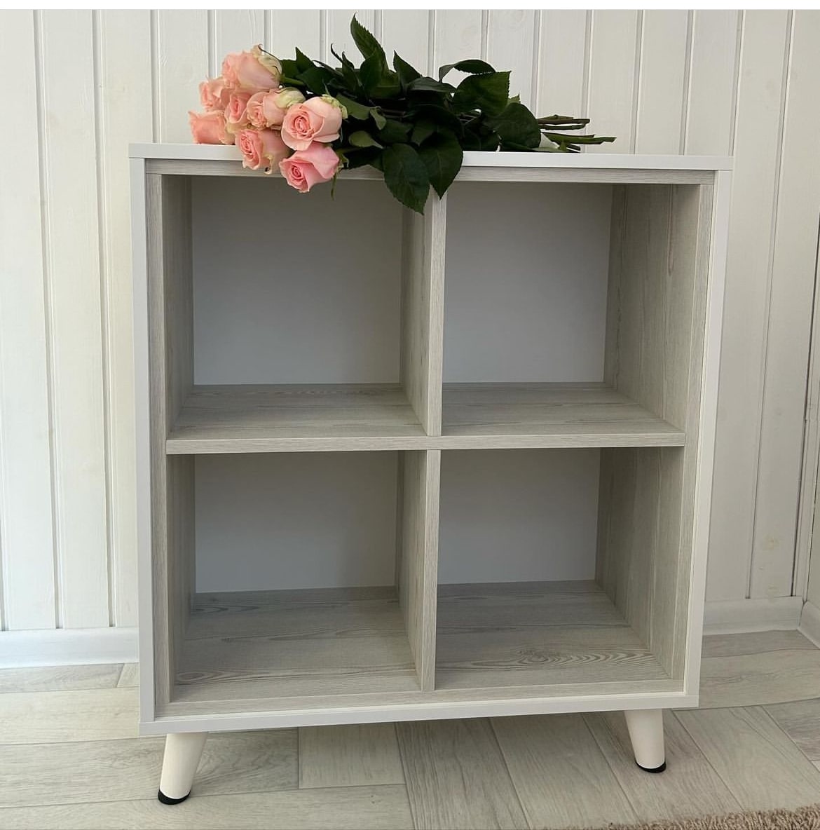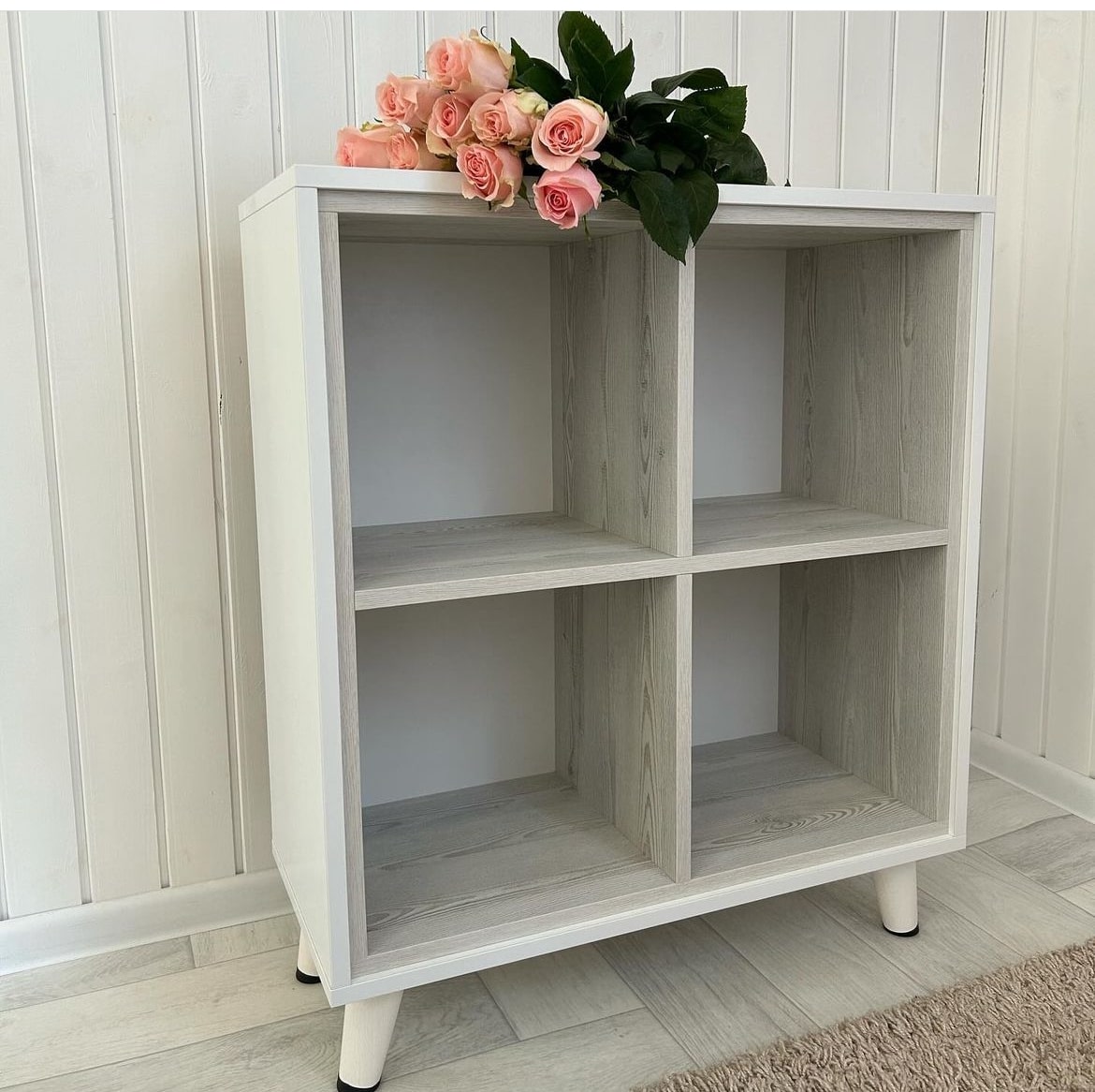 Стильная модель стеллажа на высоких опорах в цвете белый + сосна лофт.