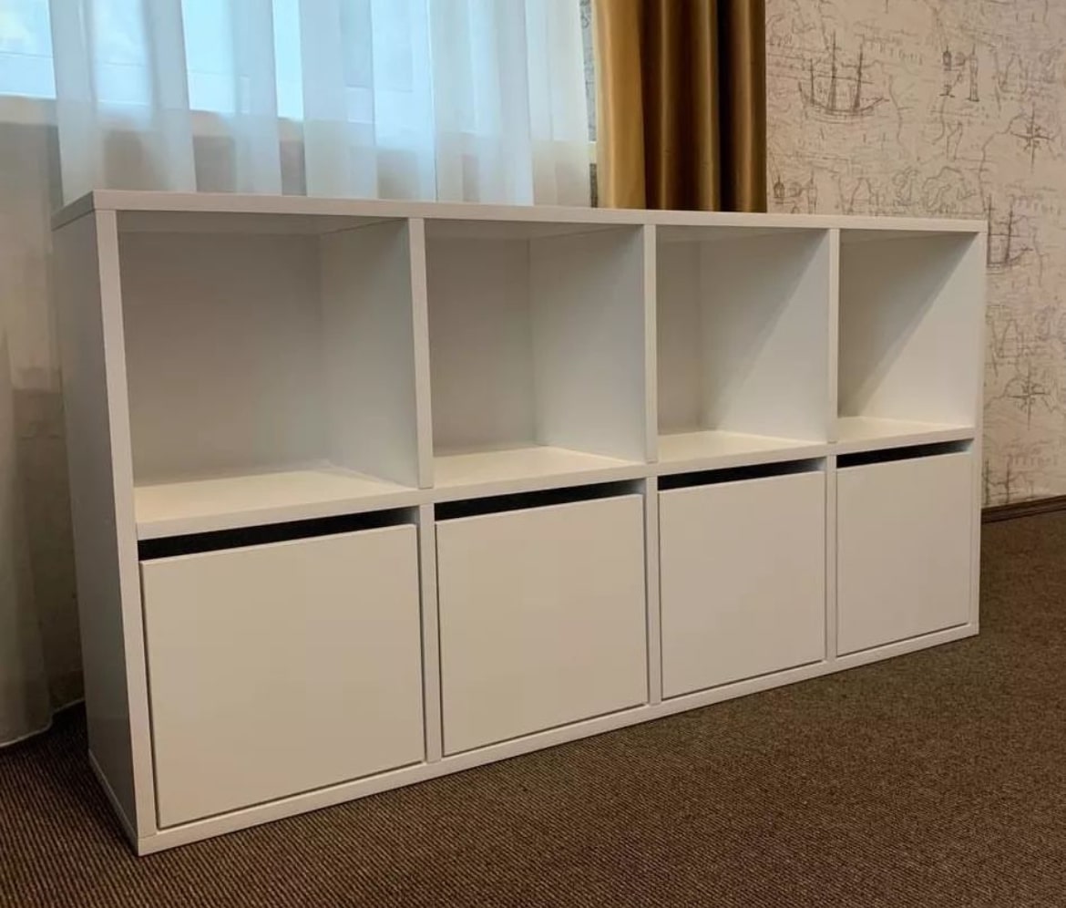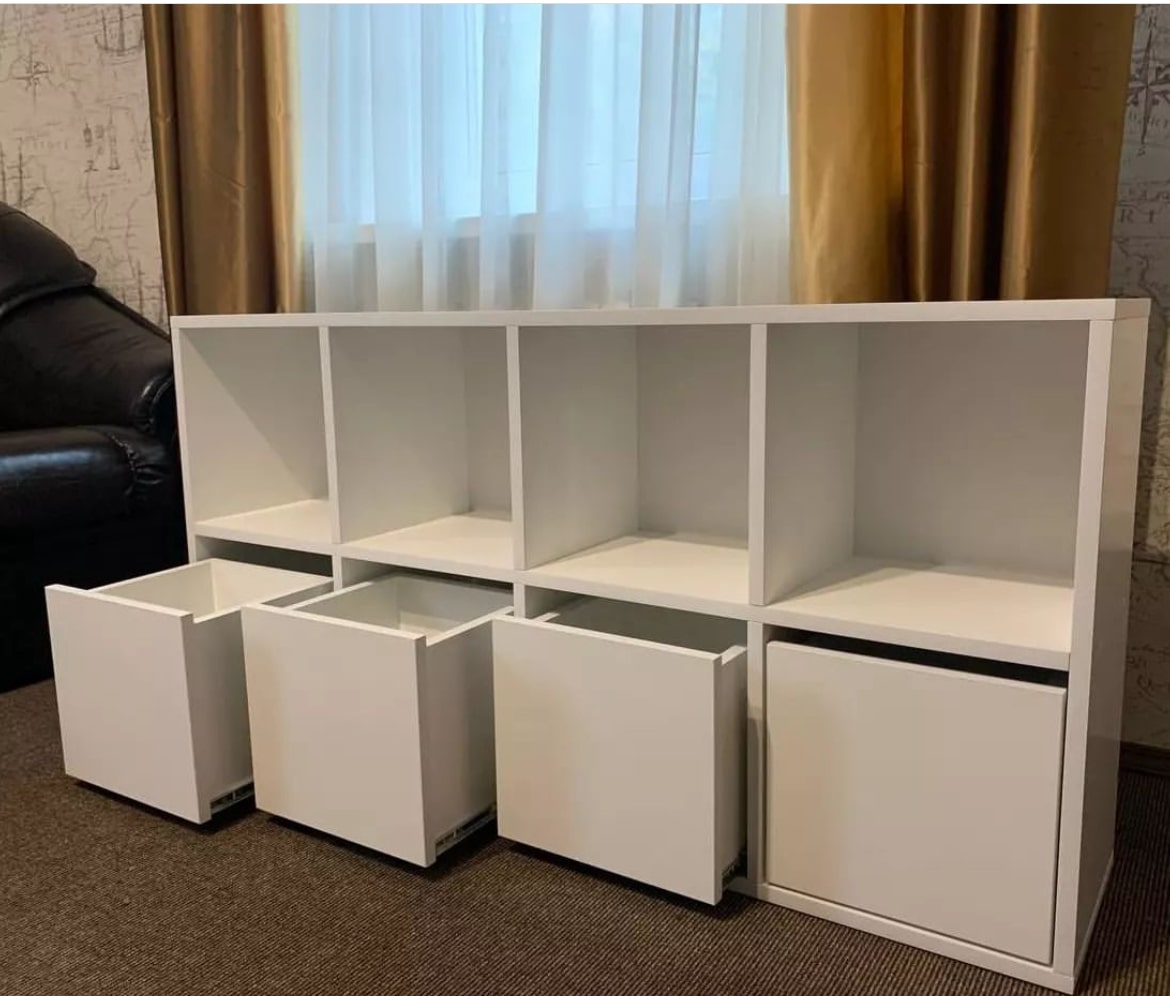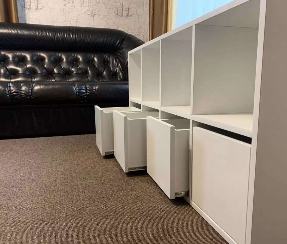 Стеллаж на 8 ячеек, нижний ряд выдвижные ящики на шариковых направляющих полного выдвижения.