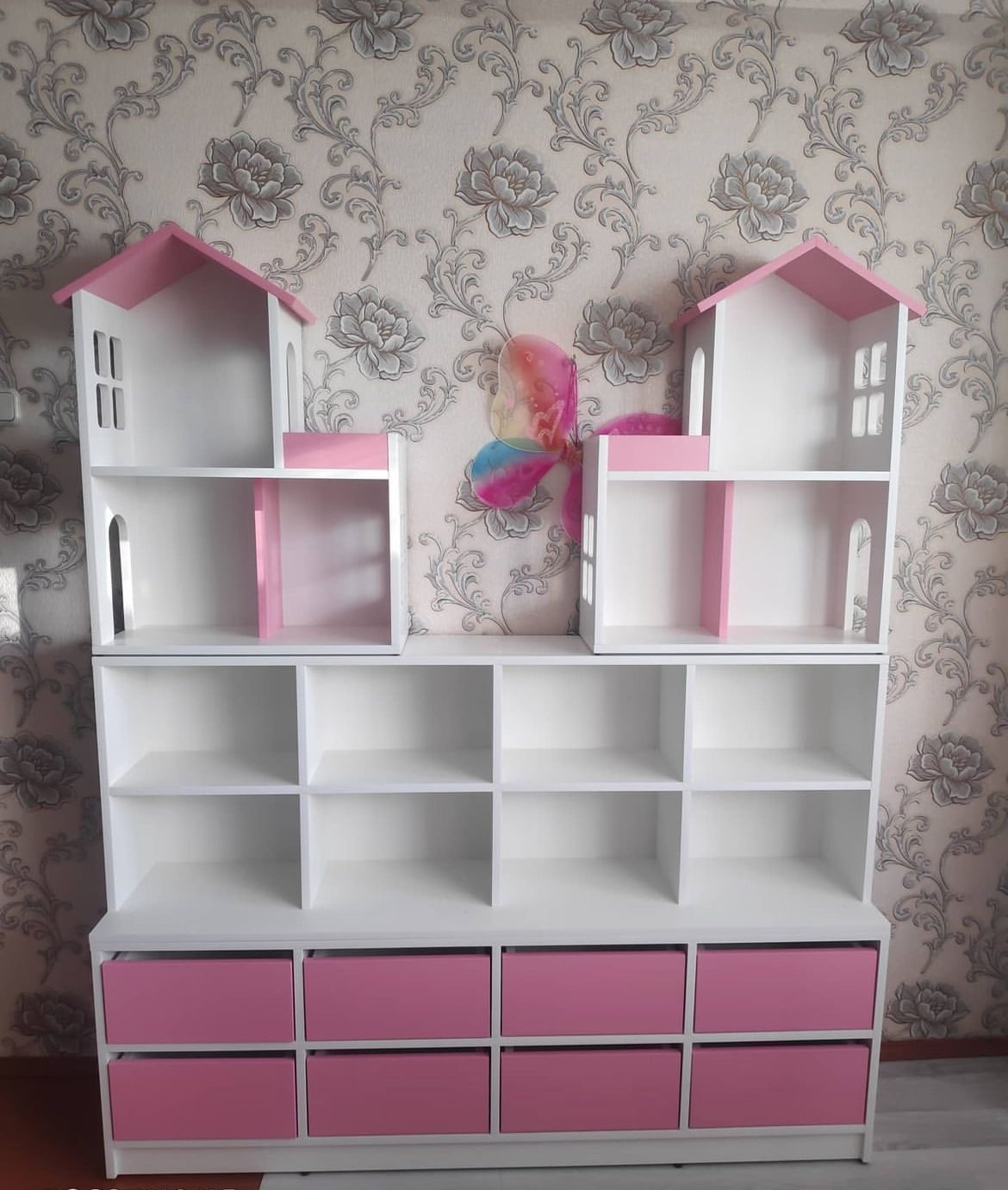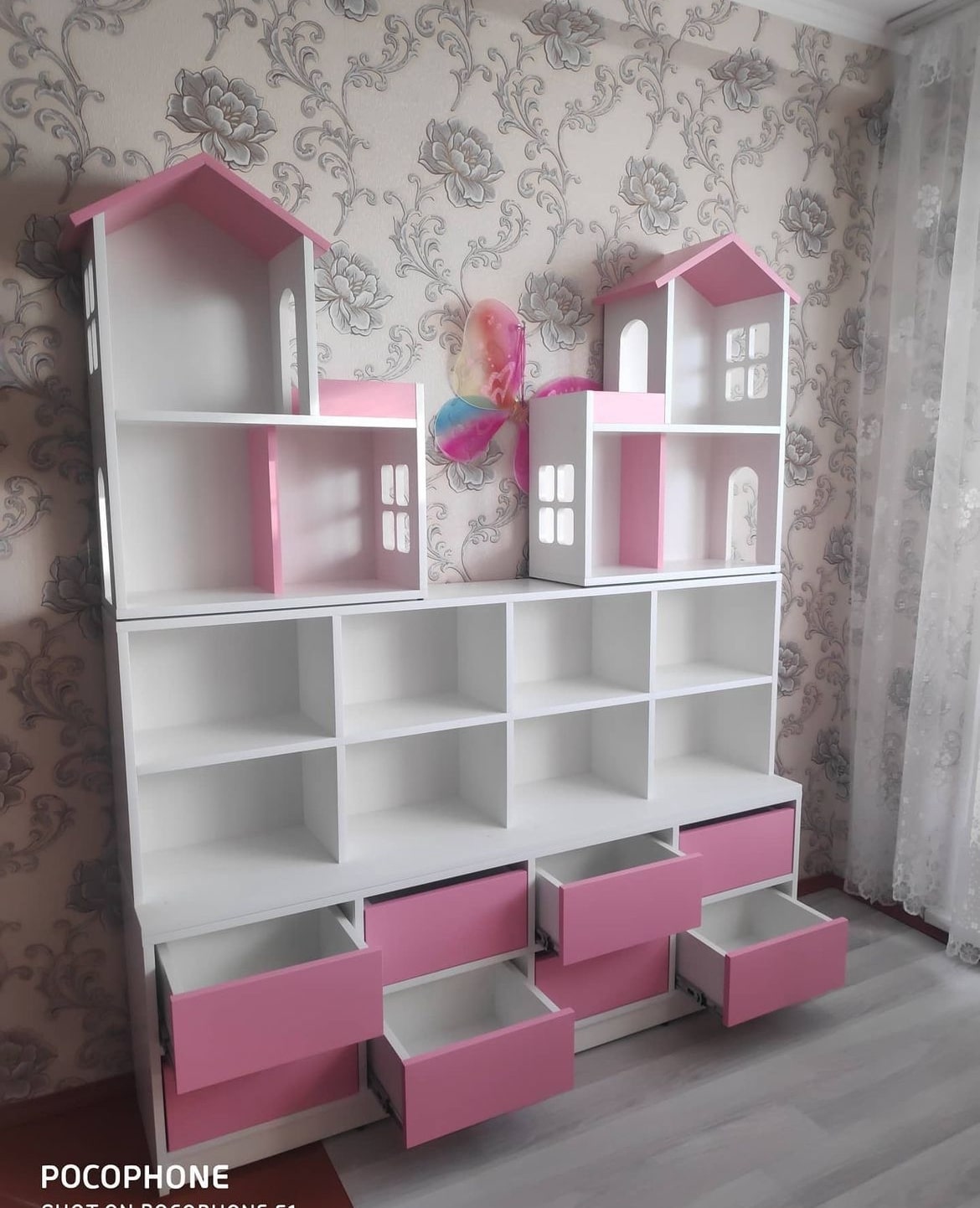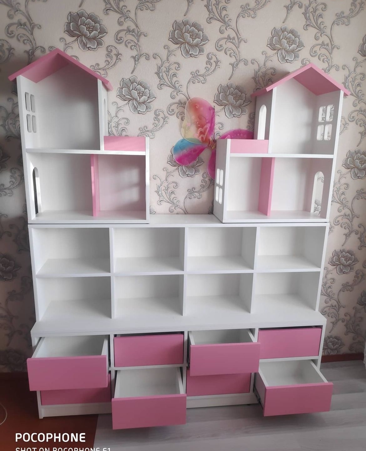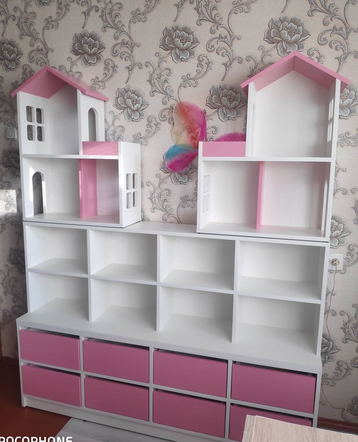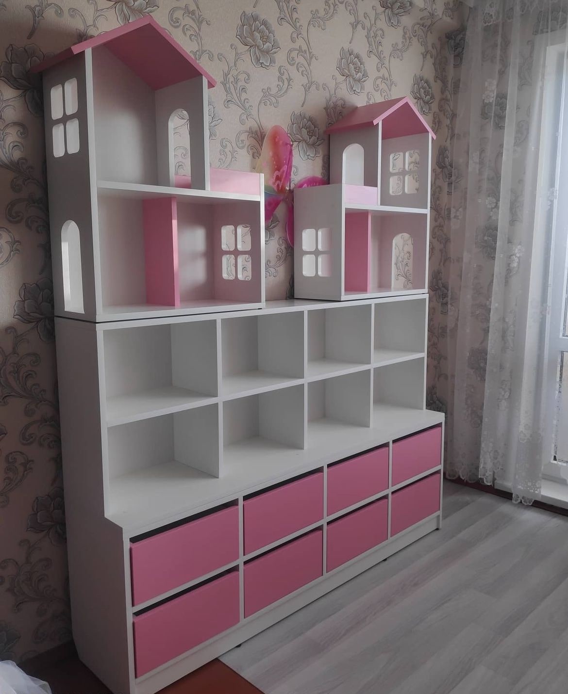 Стеллаж изготавливался для двух близняшек. Верхние домики съемные.