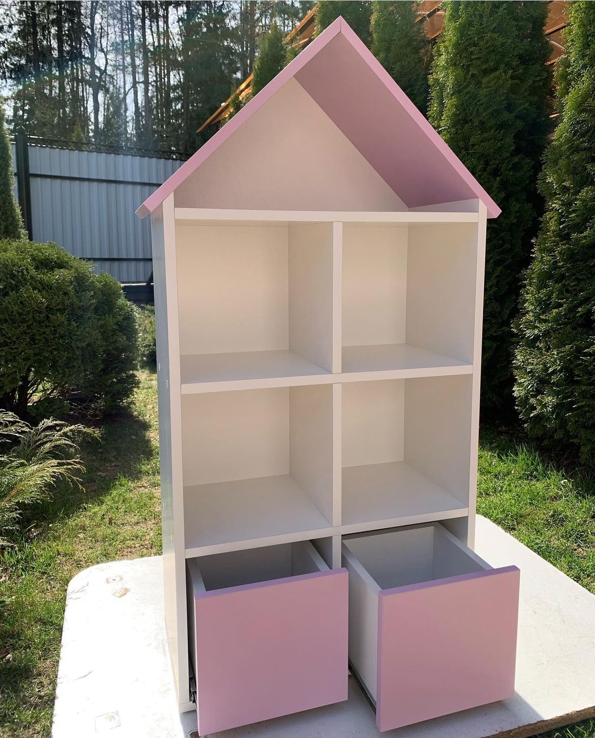 Стеллаж в виде домика с двумя выдвижными ящиками.