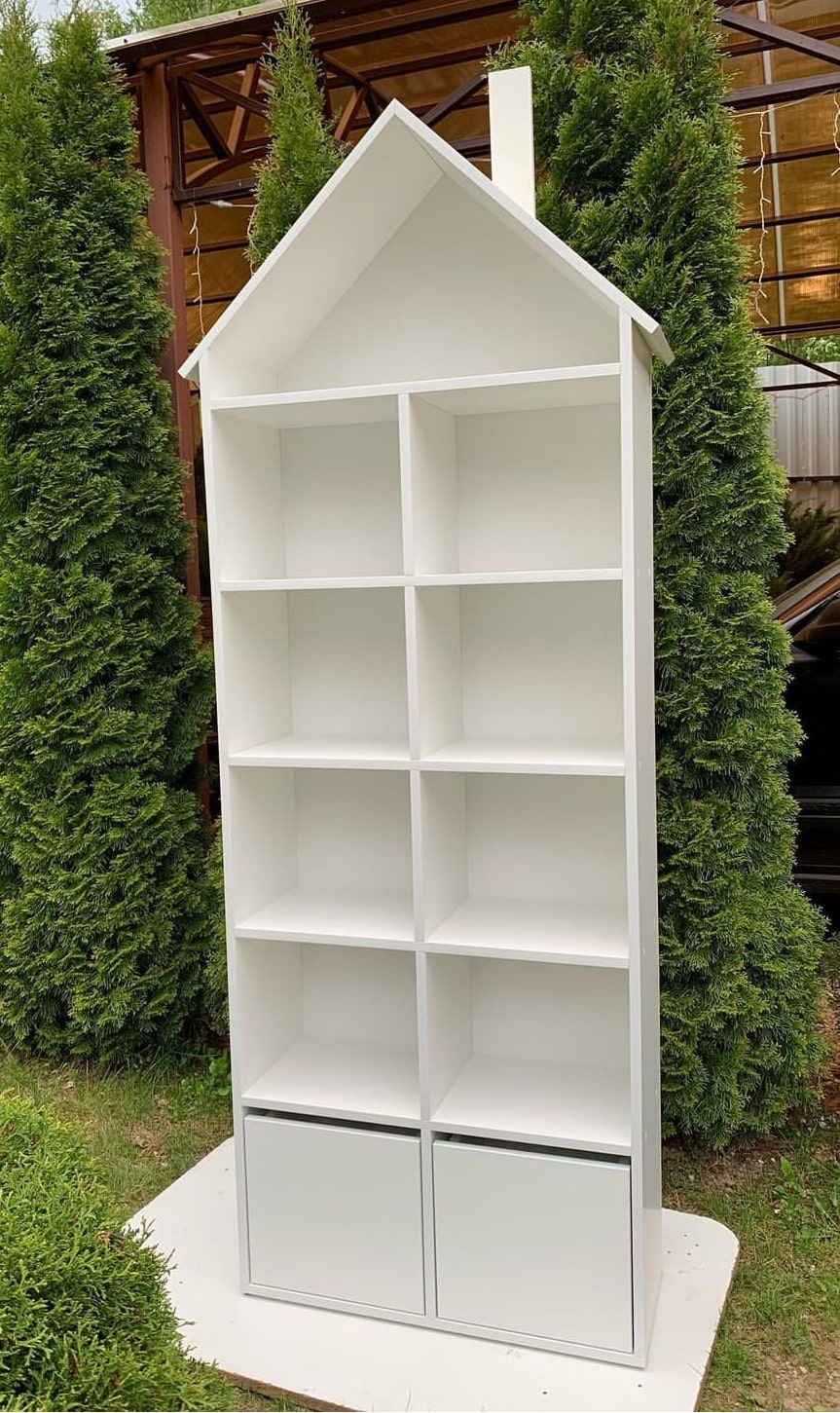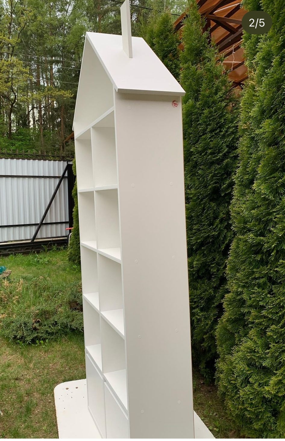 Очень высокий, вместительный стеллаж в виде домика. Подойдет для любого интерьера, офиса, домашней библиотеки.