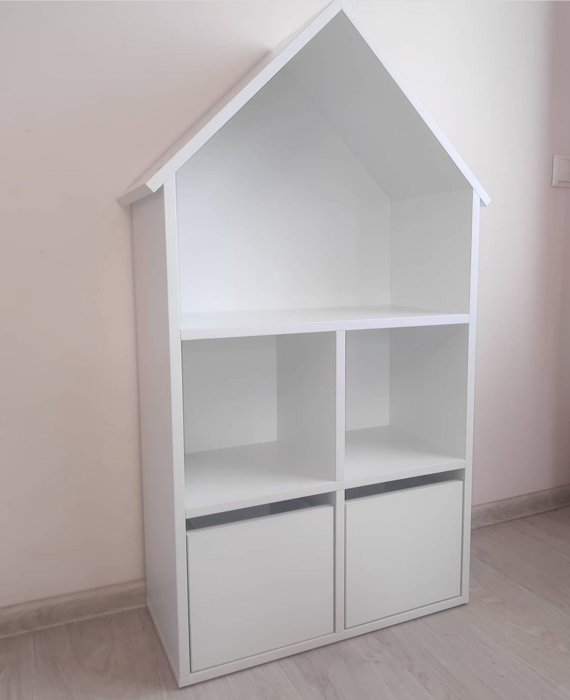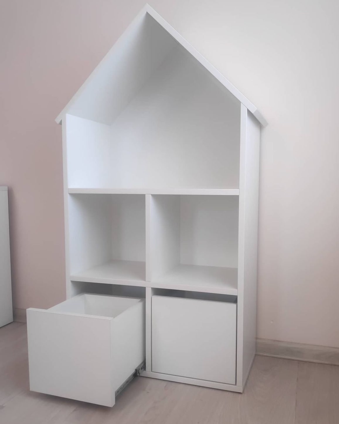Стеллаж в виде домика с двумя выдвижными ящиками.