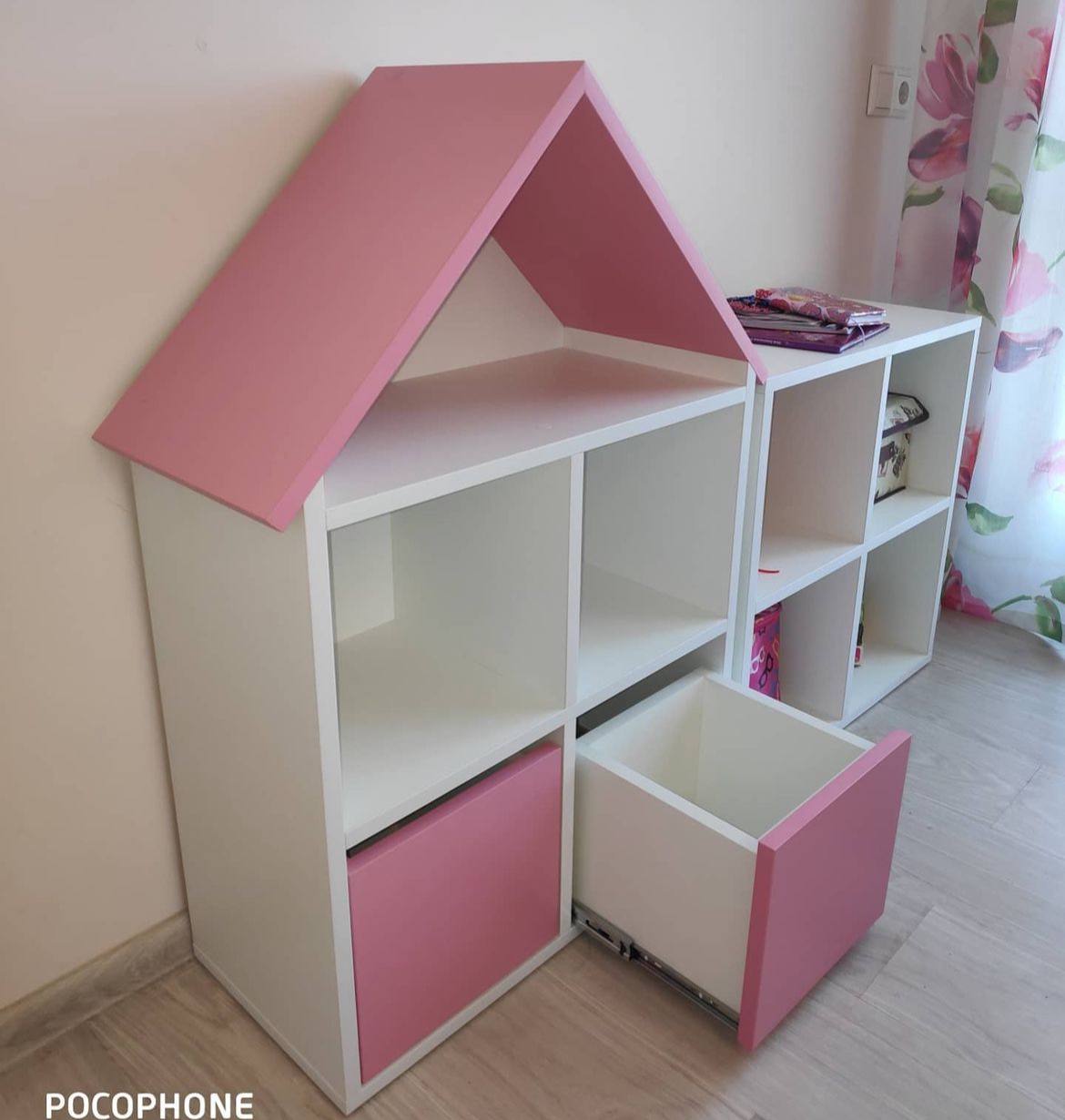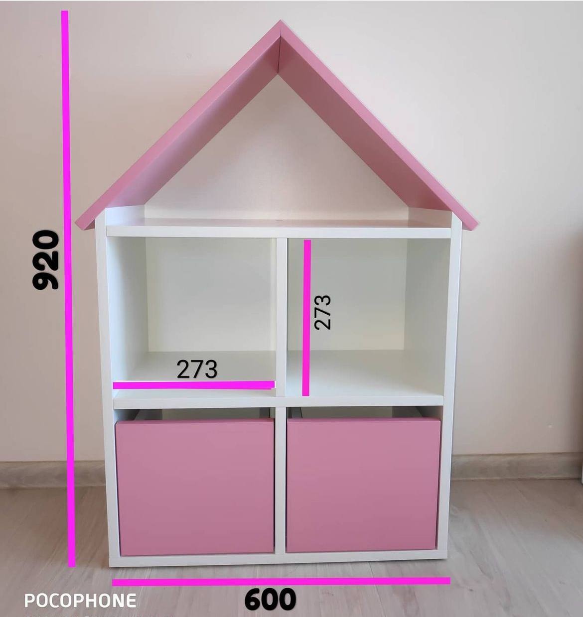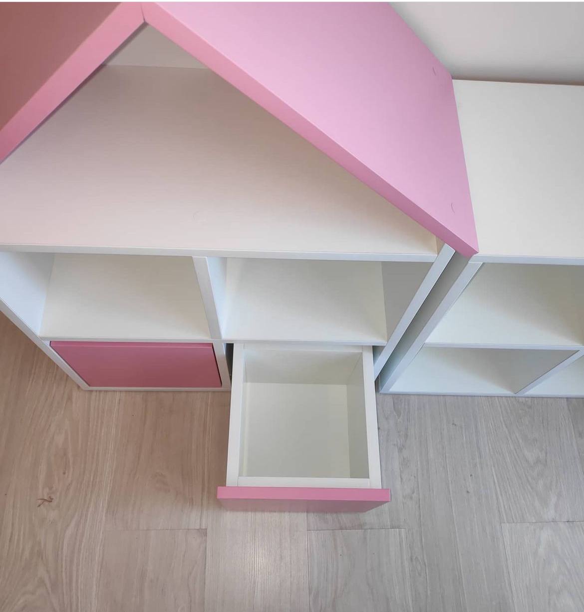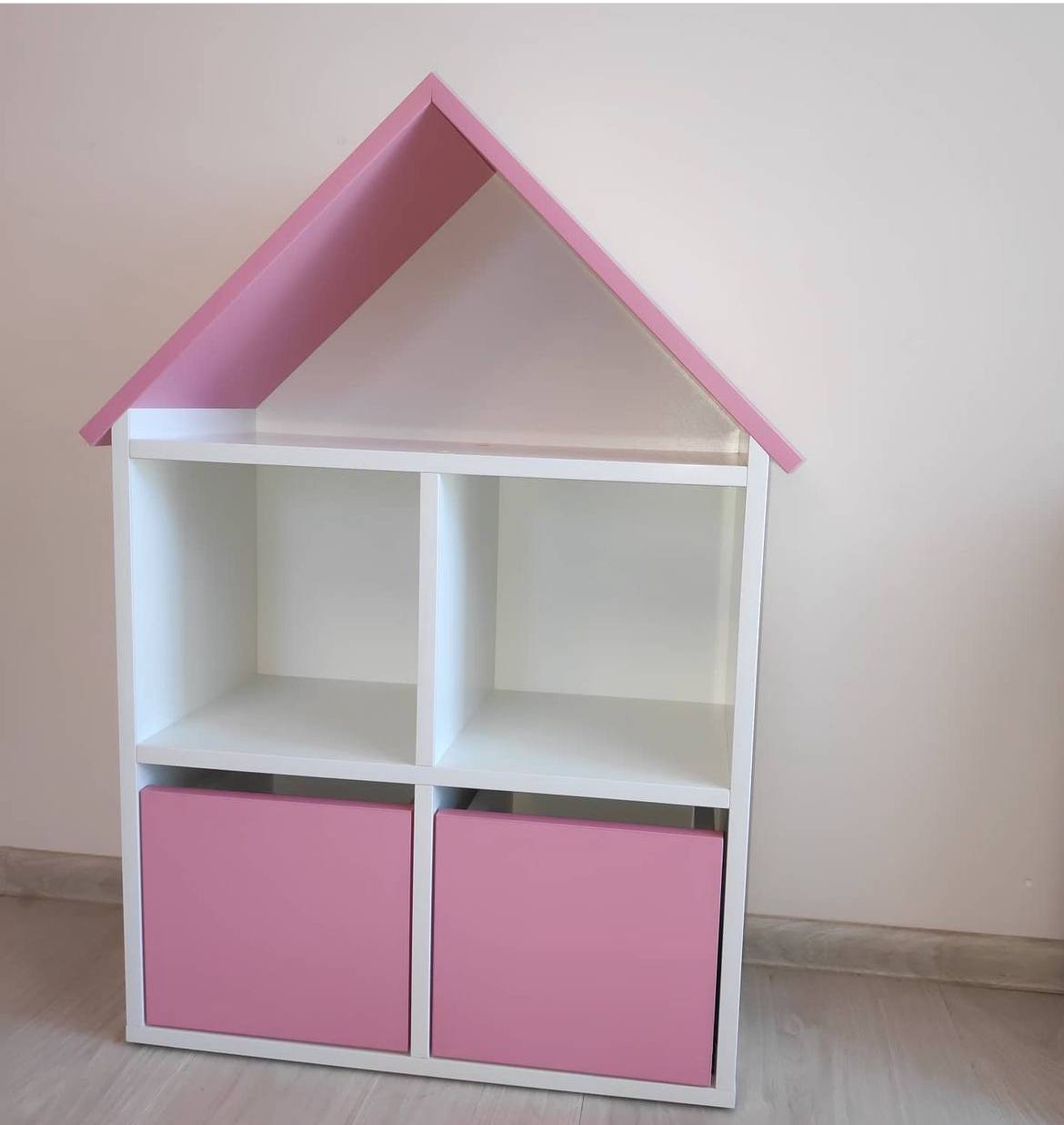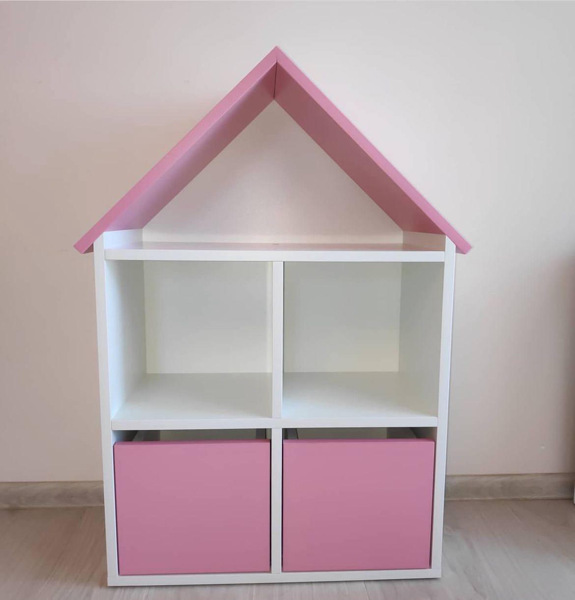 Стеллаж-кубик с крышей, в виде домика, с добавлением цвета роза.